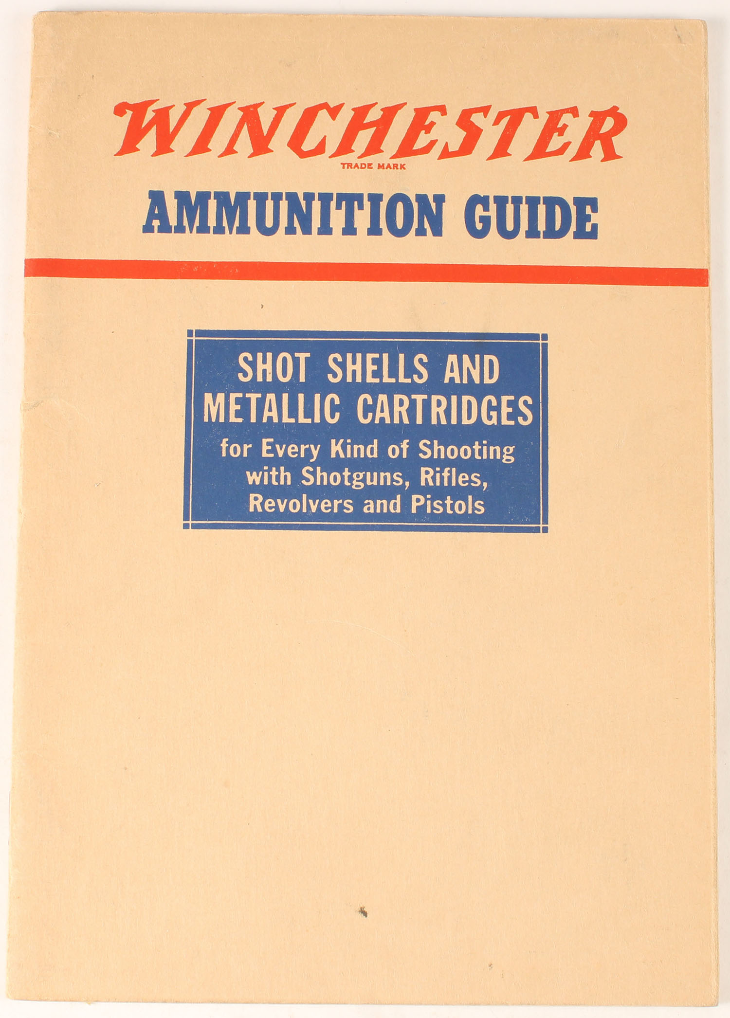 Winchester Ammunition Guide: Shotshells and Metallic Cartridges for every kind of shooting with shotguns, rifles, revolvers and pistols 3rd edition, 44 pages, 6'' x 8 1/2''. Pages clean, staplebound, b/w images. Grade: Very Good ++ - Value: 10 to 60