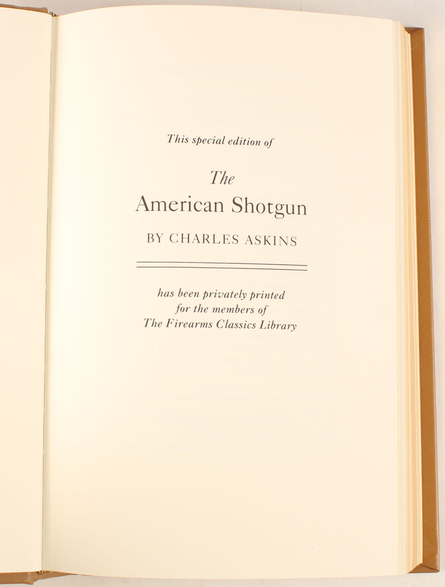 The American Shotgun by Charles Askins 2000, 5 1/2'' x 8 1/2''. 321 pages, pages clean, gold gilt titling, silk ribbon page marker, binding tight, hardcover mint,. Value: $200 Grade: MINT - Value: 2 to 200