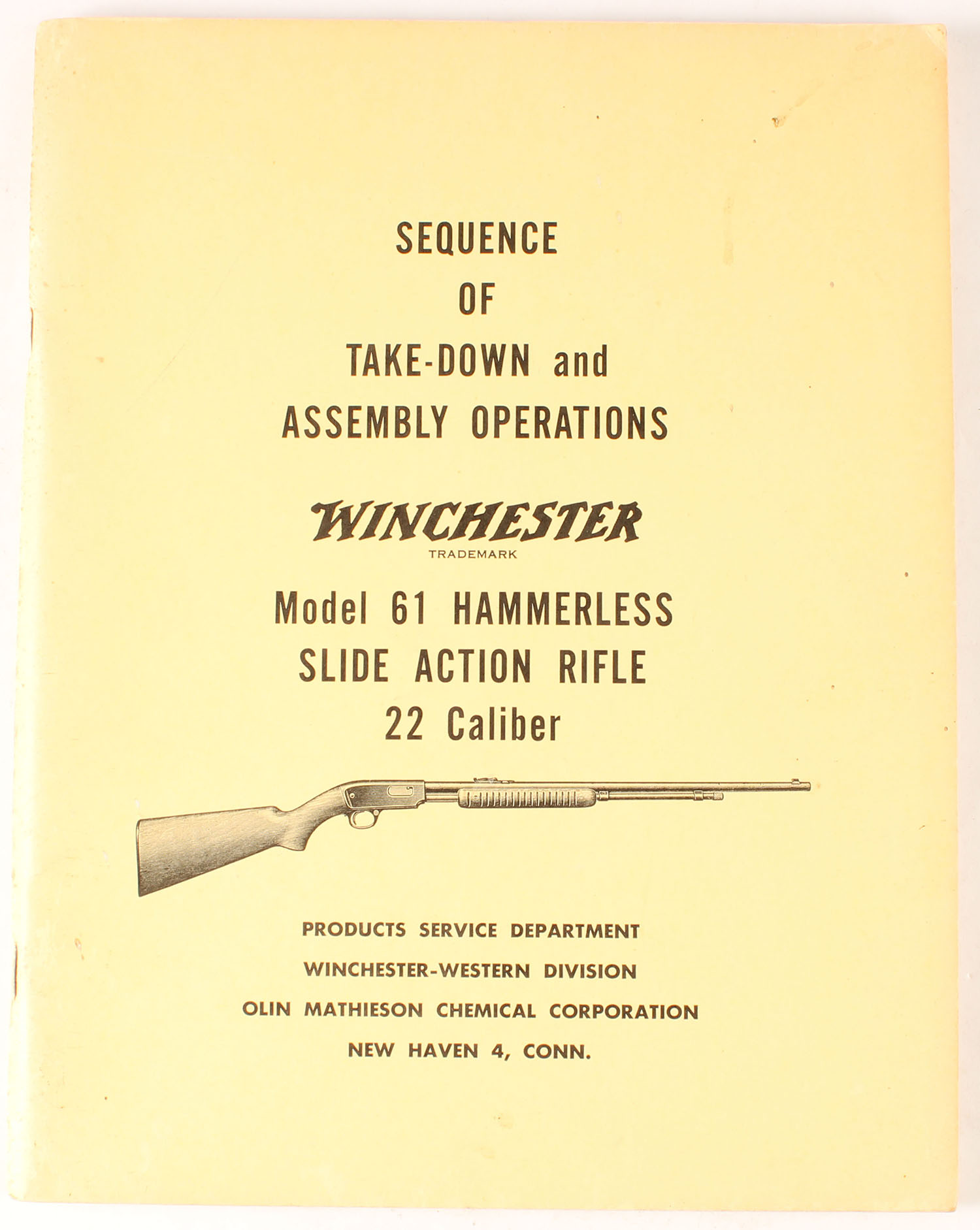 Sequence of Take-Down and Assembly Operations: Winchester Model 61 Hammerless Slide Action Rifle, 22 Caliber, 8 1/2'' x 11''. Pages clean, staplebound. Grae: Very Good + - Value: 4 to 80
