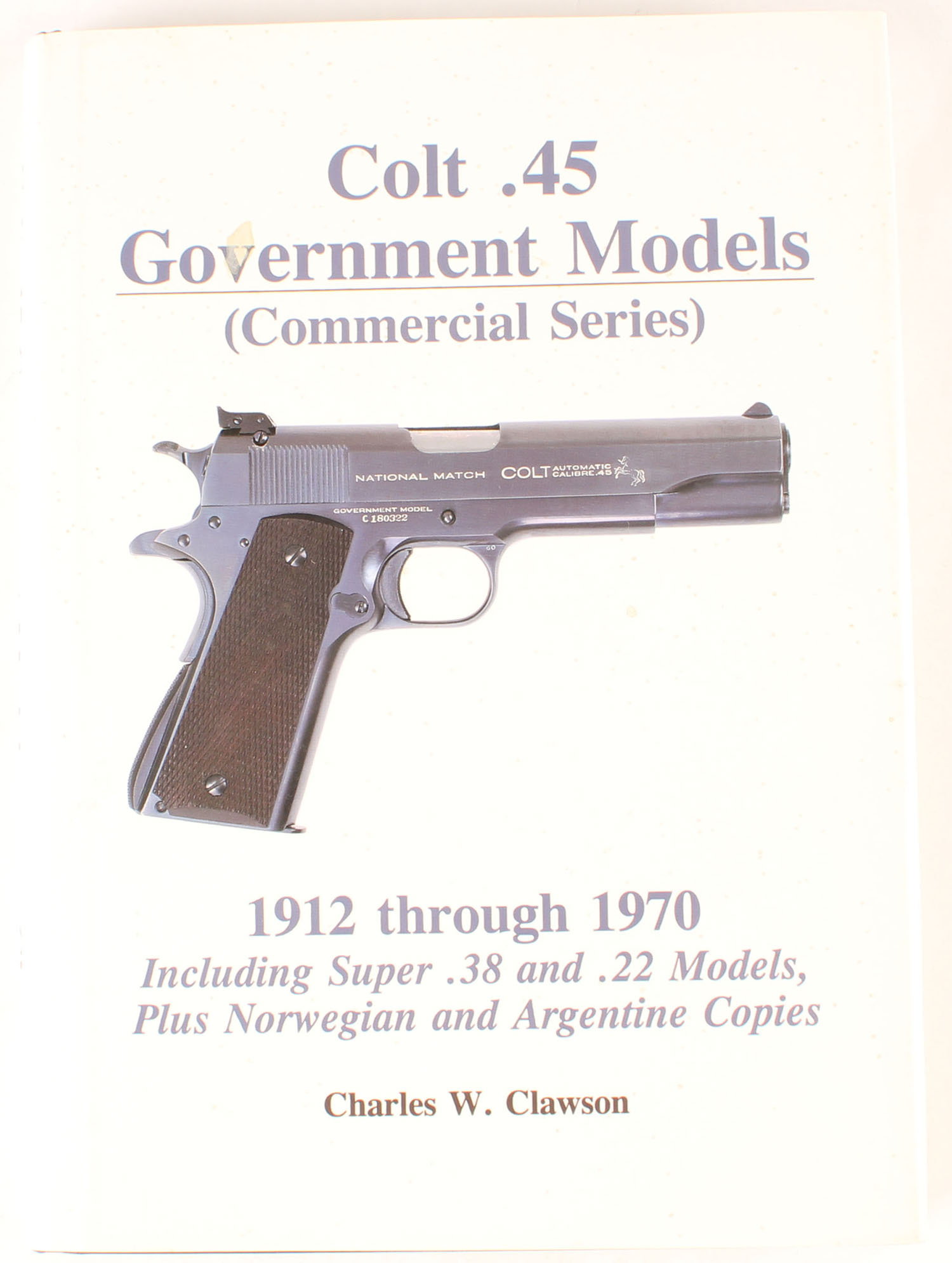 Colt .45 Government Models (Commercial Series) 1912 through 1970 including Super .38 and .22 Models, Plus Norwegian and Argentine Copies by Charles W. Clawson, 7'' x 10''. 230 pages, pages clean, binding tight, hardcover and dustjacket excellent. Value: $1,500 Grade: Excellent + - Value: 400 to 1500