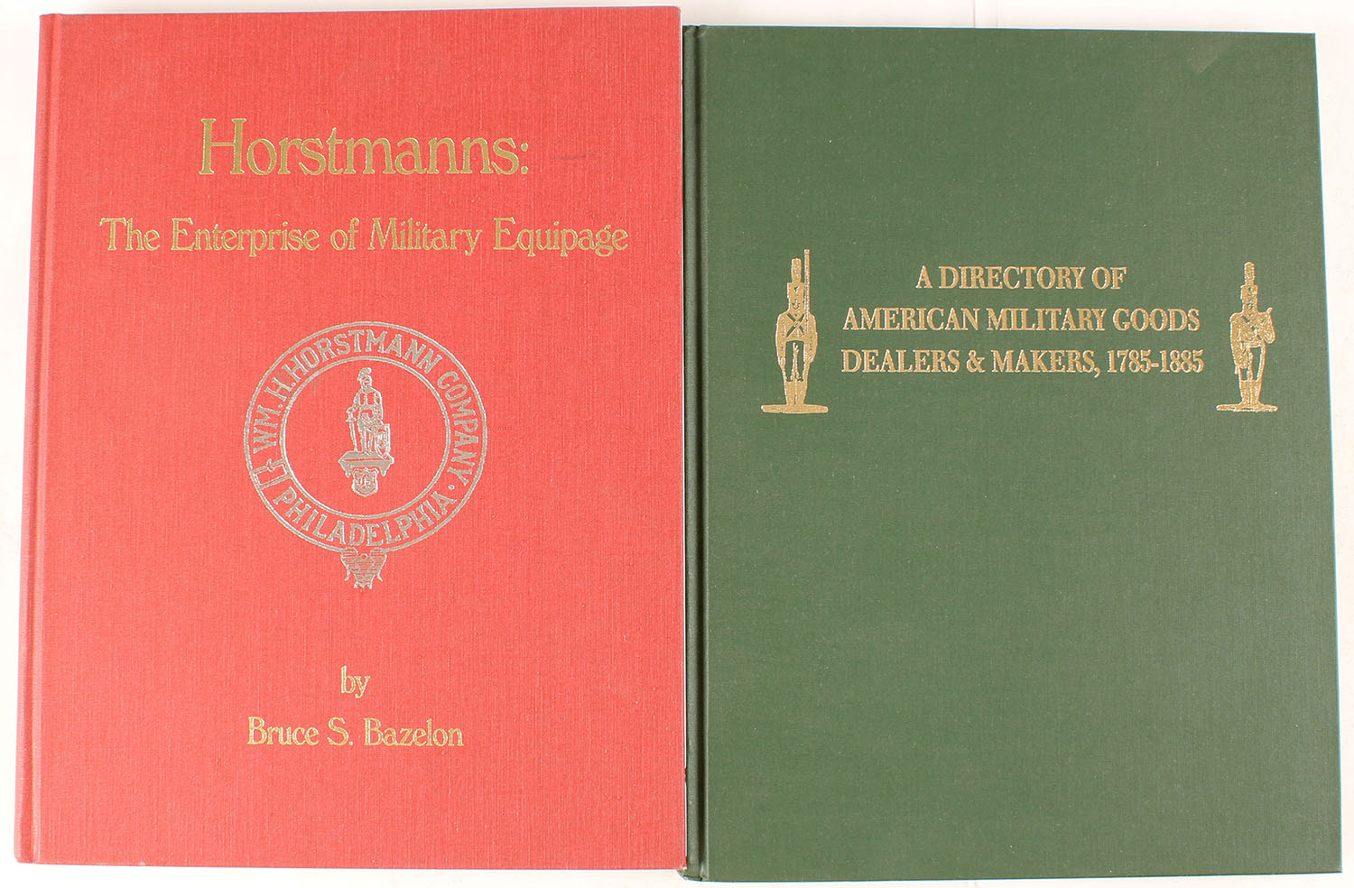 Lot of 2 (1) Military Goods Dealers & Makers, 1785-1885 by Bazelon & McCuinn, 118 pages (1) Horstmanns: The Enterprise of Military Equipage by Bruce S. Bazelon, 1999 pages, both 8 1/2'' x 11''. Hardcovers very good, pages clean, binding tight. Grade: Very Good ++ - Value: 10 to 100
