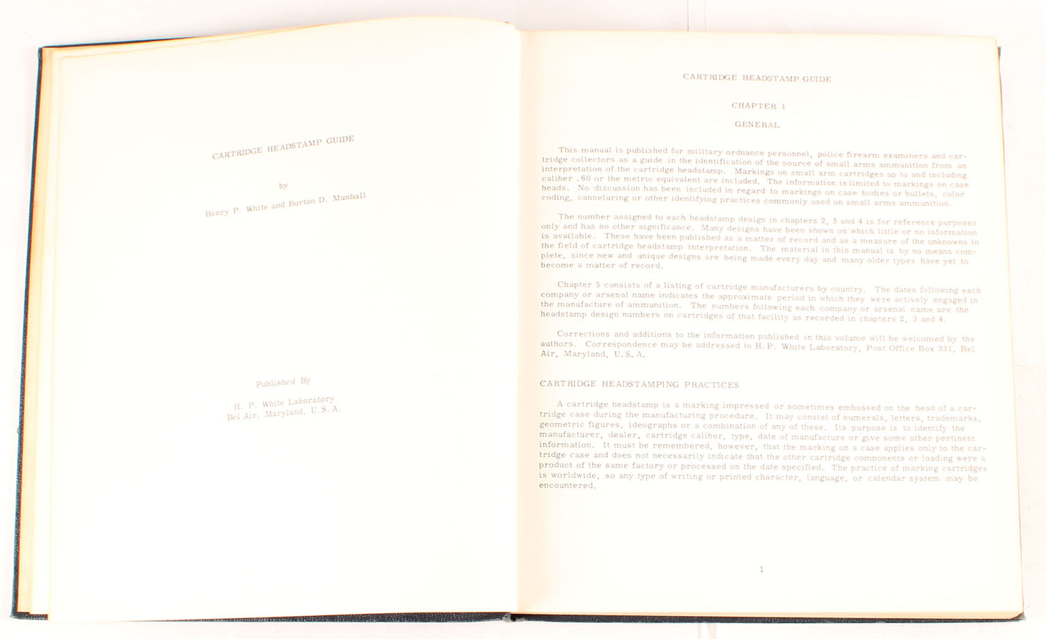 Cartridge Headstamp Guide by H.P. White and B.D. Munhall 1963, 8 1/2'' x 10''. 264 pages, pages clean, binding tight, hardcover very good. Value: $120 Grade: Very Good ++ - Value: 10 to 120