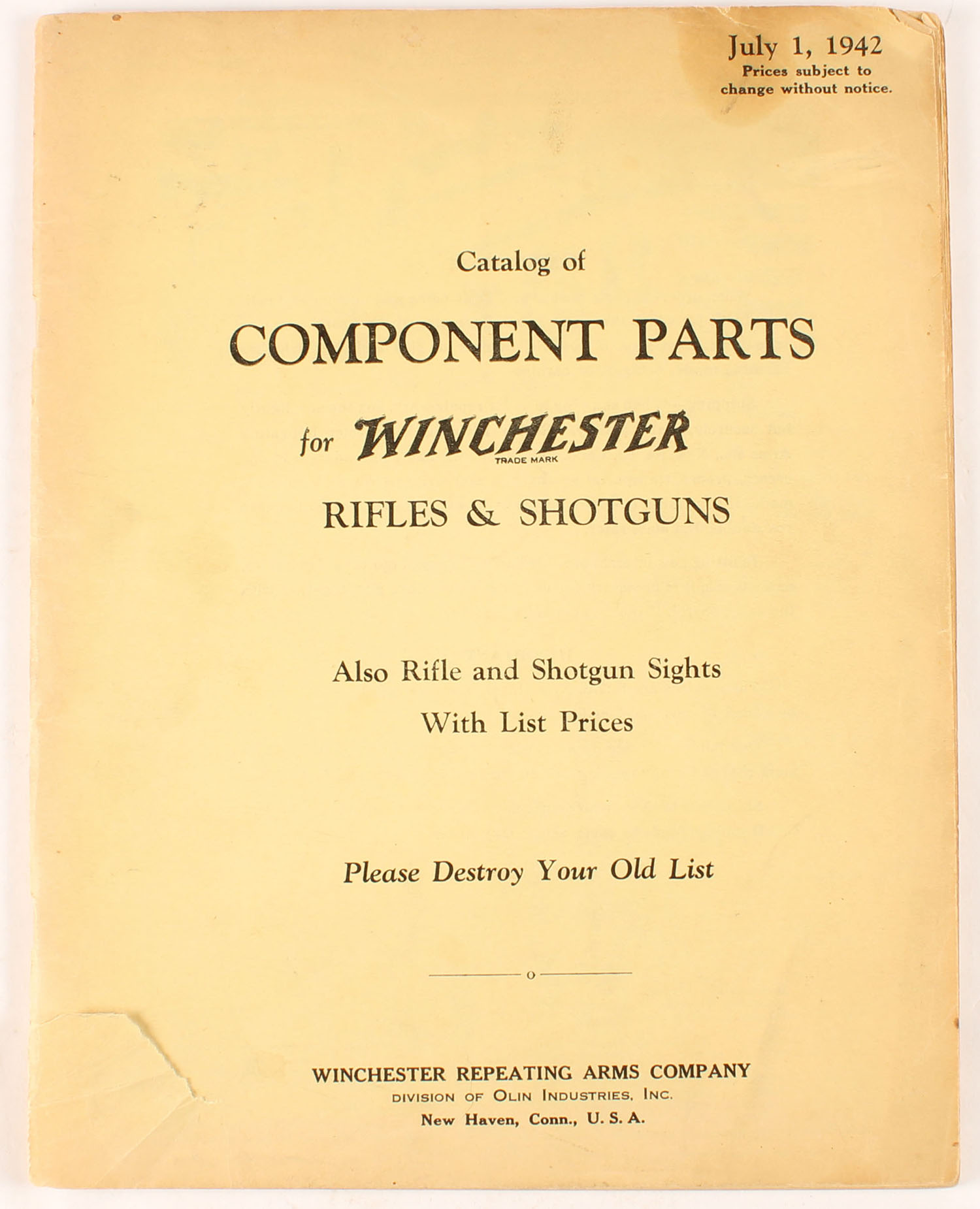 Catalog of Component Parts for Winchester Rifles & Shotguns, Also Rifle and Shotgun Sights with List Prices July 1, 1942, 8'' x 11''. Staplebound, stains on cover. Grade: Very Good + - Value: 2 to 40