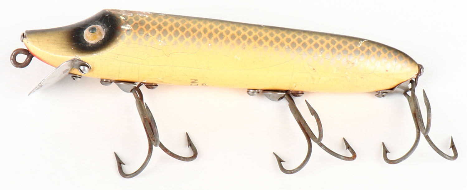 Heddon Vamp, wood lure, BE, cream with pink & silver scale, 3 hooks, Surface-rig, 4 3/8'', marked on lip. Grade: Very Good - Value: 10 to 40