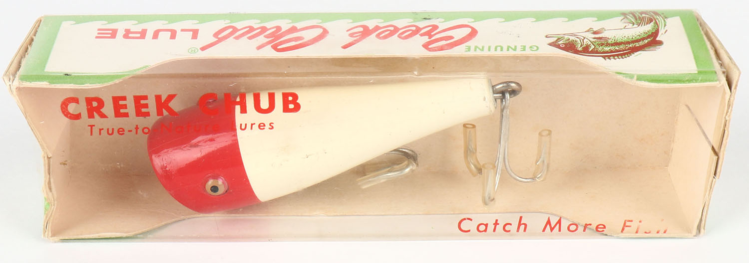 | Boxed Creek Chub Plunker, red & white, wood lure, TE, 2 hooks, ...