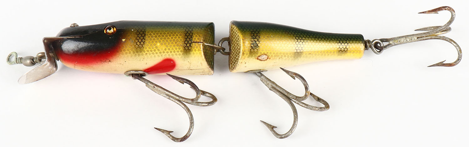 Creek Chub Musky Jointed Pikie, Pikie finish, wood lure, GE, 3 hooks, marked on back, Cup rig, 7''. Grade: Very Good ++ - Value: 20 to 60