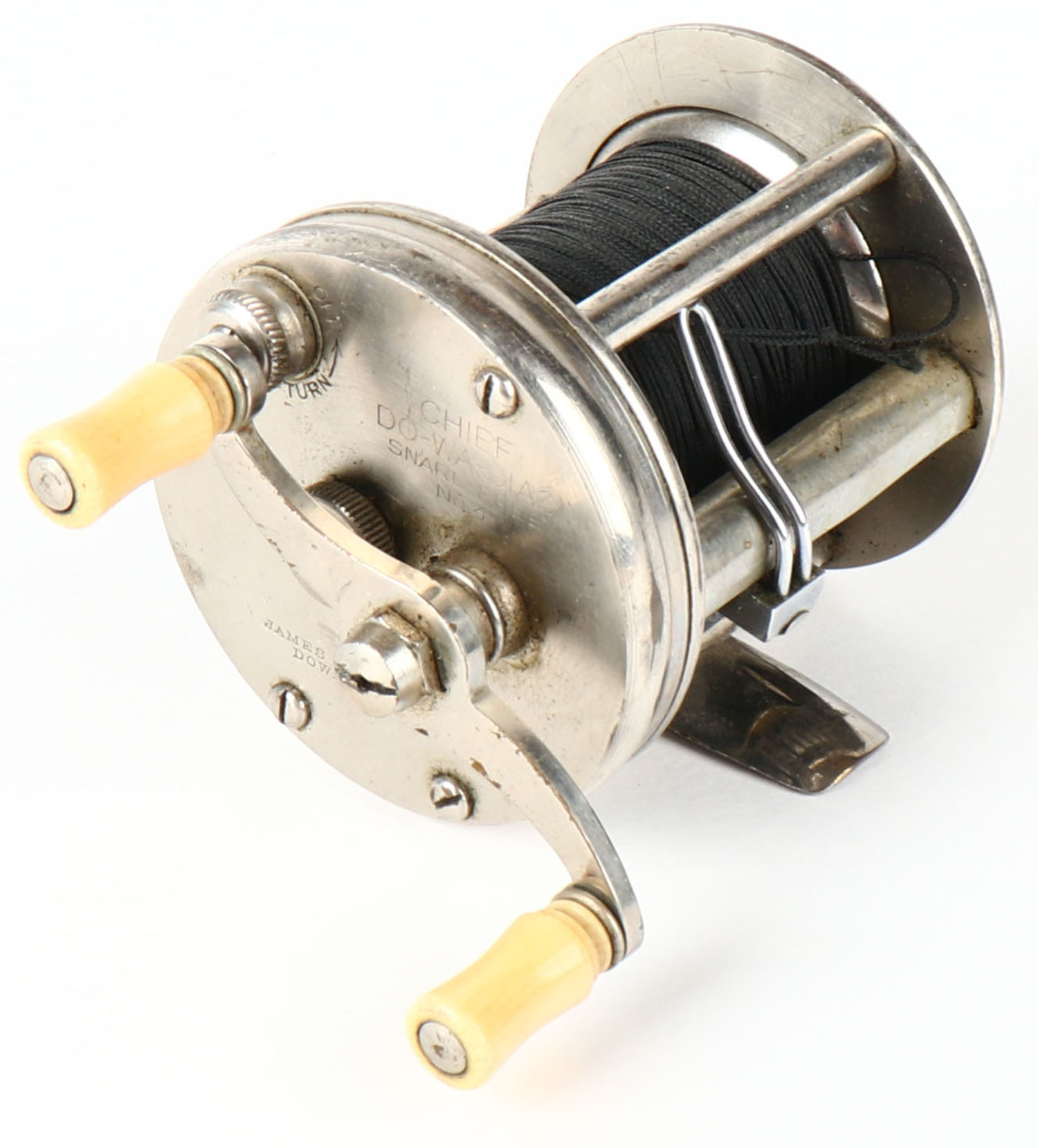 James Heddon & Sons, Chief DO-WA-GIAC No. 4 Bait Casting level wind reel, dual handle, strong click, works well. Grade: Excellent - Value: 20 to 50