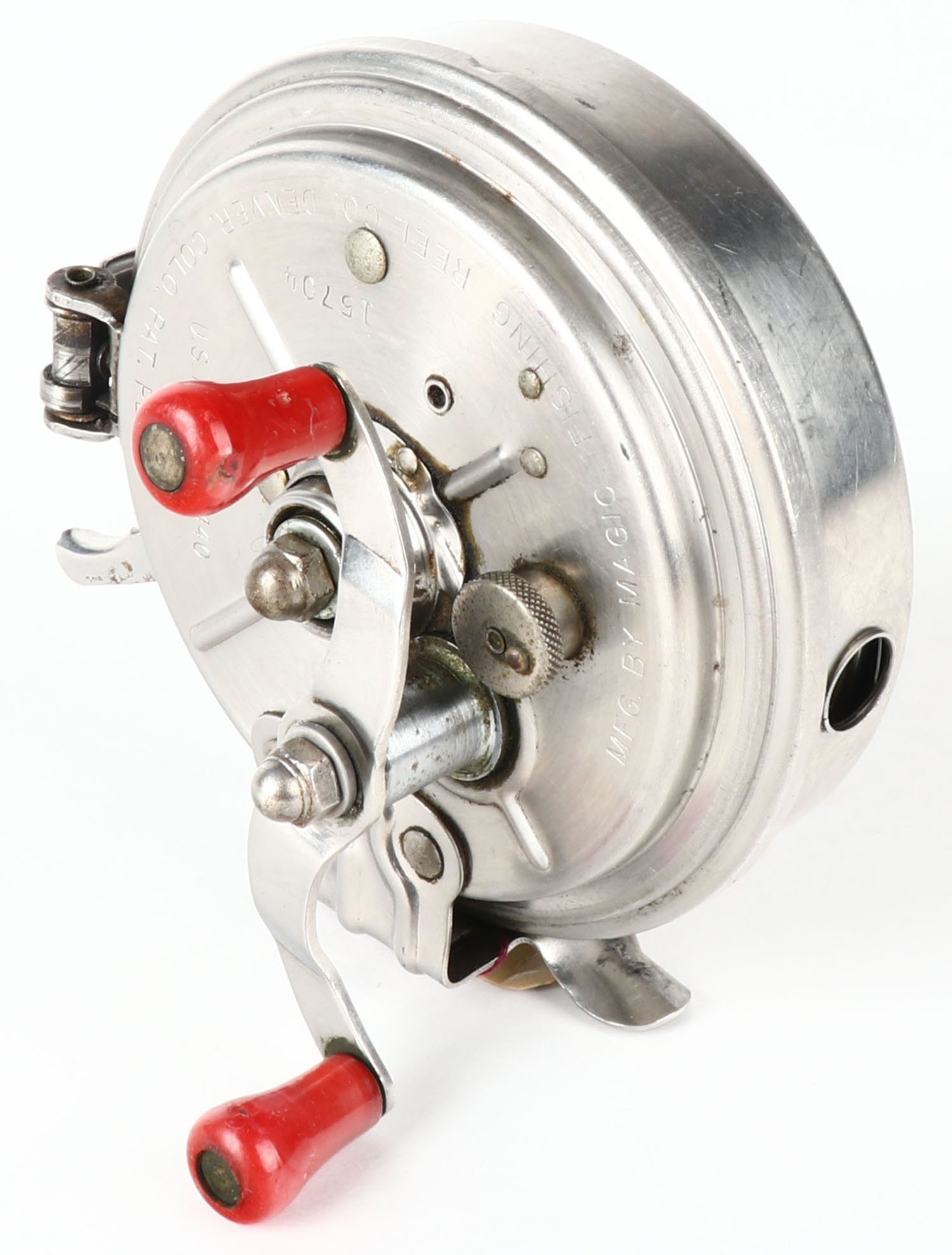 Magic Fishing Reel No 15704, Denver CO, dual red handles, works well. Grade: Excellent - Value: 10 to 50