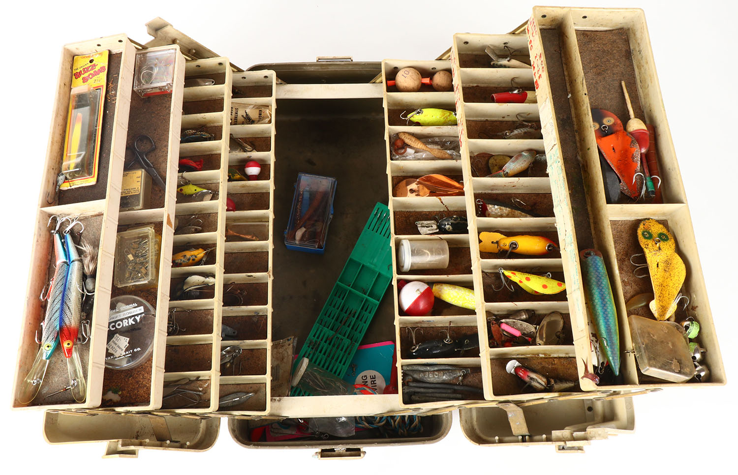 Large tackle box full of gear for bass & trout, 19'' wide. Grade: Very Good - Value: 10 to 50
