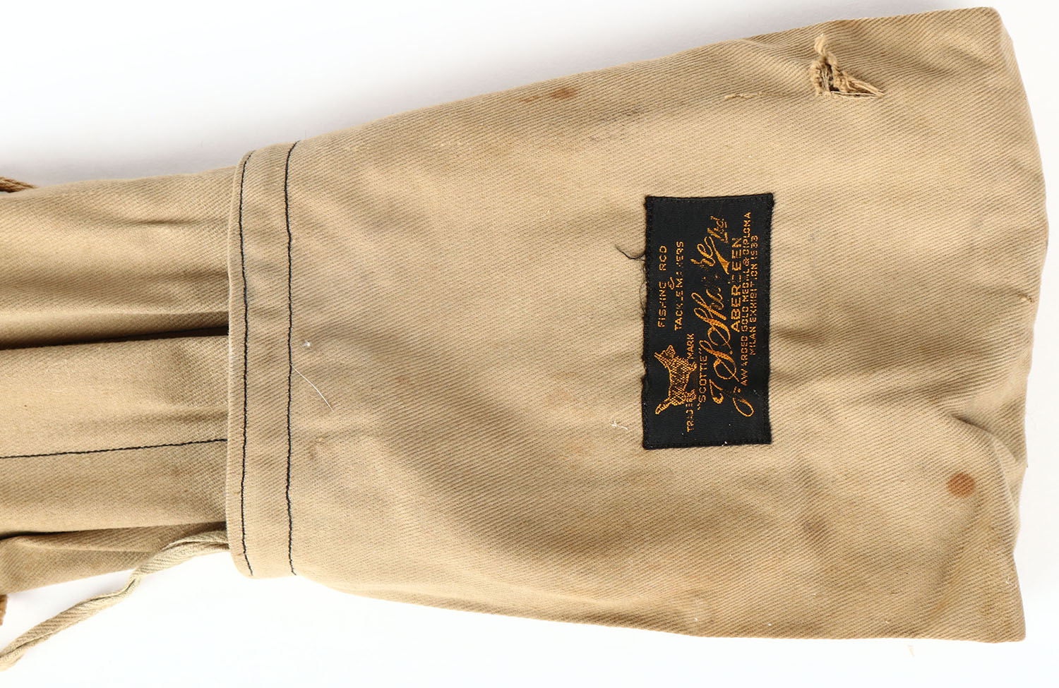 RARE J.S. Sharpee Aberdeen Scottie bamboo fly rod, SN: 72, 12' 6'', 9wt, 3/1, rod is near mint with light wear to a few wraps, cork is nice but has lightly darked from use, has wood caps in ferrules, marked cloth bag, Very Rare rod in wonderful condition. Grade: Excellent - Value: 100 to 300