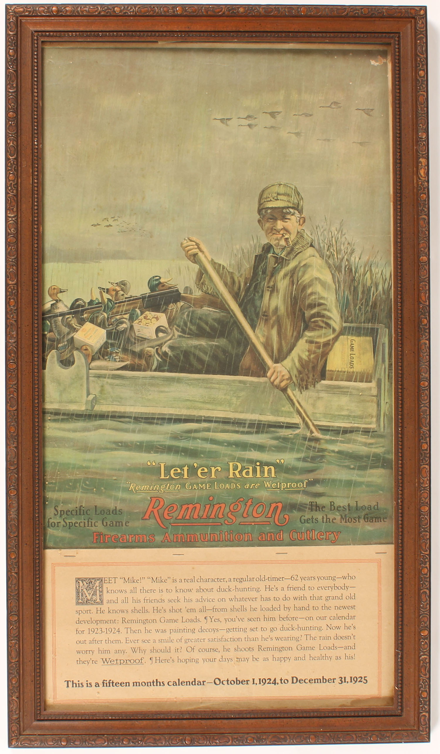 1925 Remington ''LET'ER RAIN'' Calendar, pictures duck hunter in duck boat with decoys, 2pc. Shotshell boxes & an Auto loader, 15'' x 28 1/2'''', metal band on top with brass hanger, Full Pad of Pages, has one scuff mark to top right otherwise very nice, nice colors, great duck hunting image, framed. Grade: Excellent - Value: 2000 to 4000