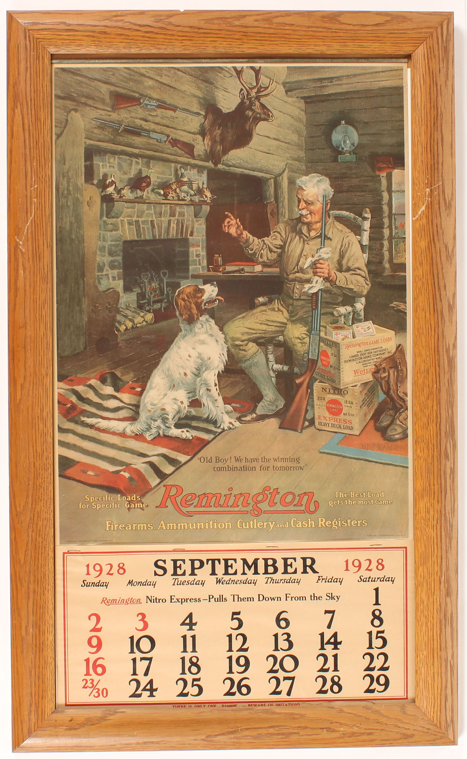 1928 Remington ''OLD BOY!, We have the sinning combination for tomorrow'' Calendar, pictures OLD MAN UNTER WITH HIS English Setter & a pump shotgun, 2pc. & Shotshell boxes, 15'' x 27 1/2'''', metal band on top with brass hanger, Sept. Page, has wear & appears to be in mint condition, wonderful colors, great log cabin hunting image, framed. Grade: Excellent ++ - Value: 1000 to 3000