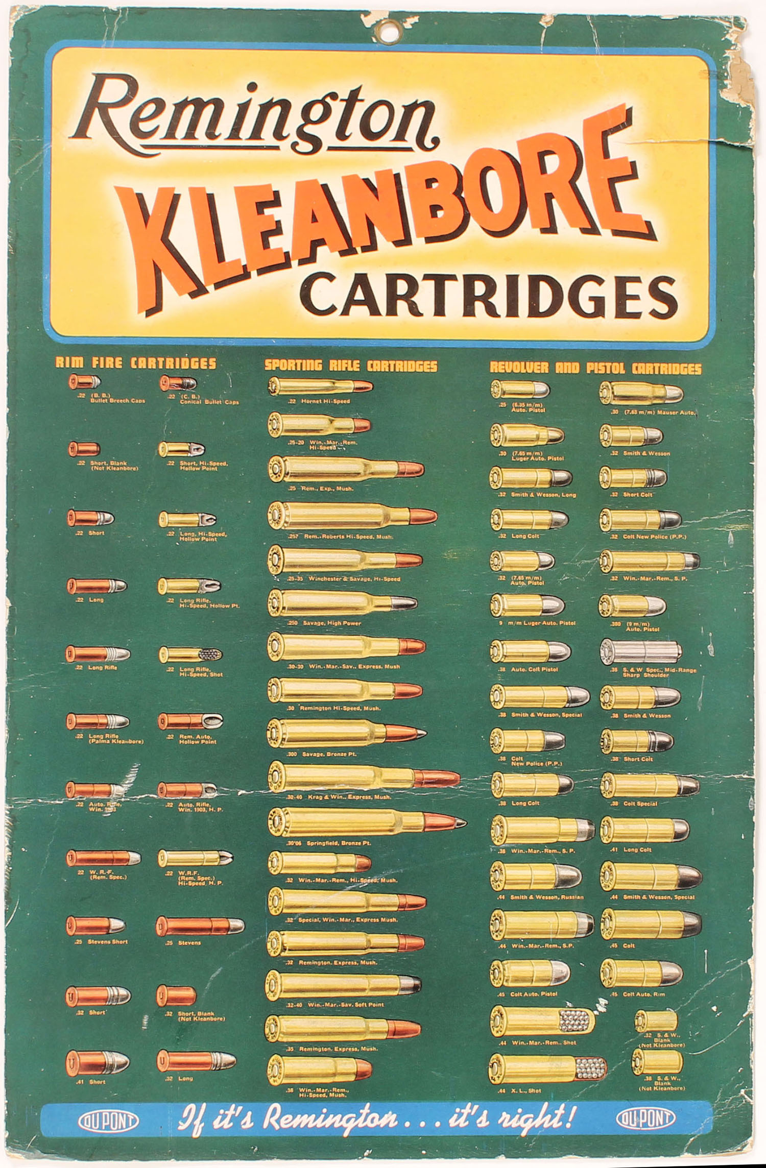 Remington KLEANBORE Cartridges Diecut, pictures all cart. Calibers in full color, has metal gromet for hanging, shows edge wear & tear to top right, 13'' x 20''. Grade; Good ++ - Value: 20 to 100