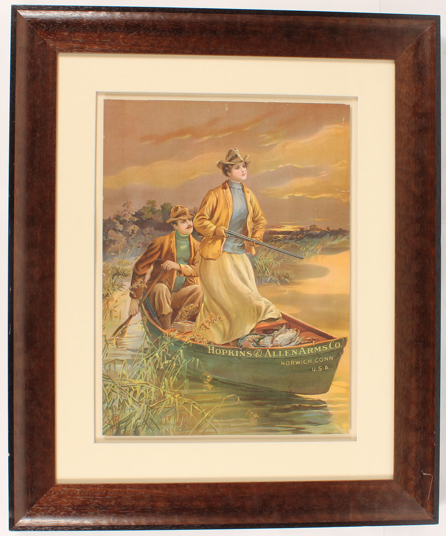 1904 RARE Hopkins & Allen Arms Co. Poster, has fantastic colors that pictures man & woman duck hunting in a boat as a storm is approaching with mallard on the bow & holding a double shotgun, 14 3/4'' x 19 3/4'', no band, framed, shows almost no wear with great colors, one of the rarest poster you can buy & only one we have seen. Grade: Excellent - Value: 3000 to 8000