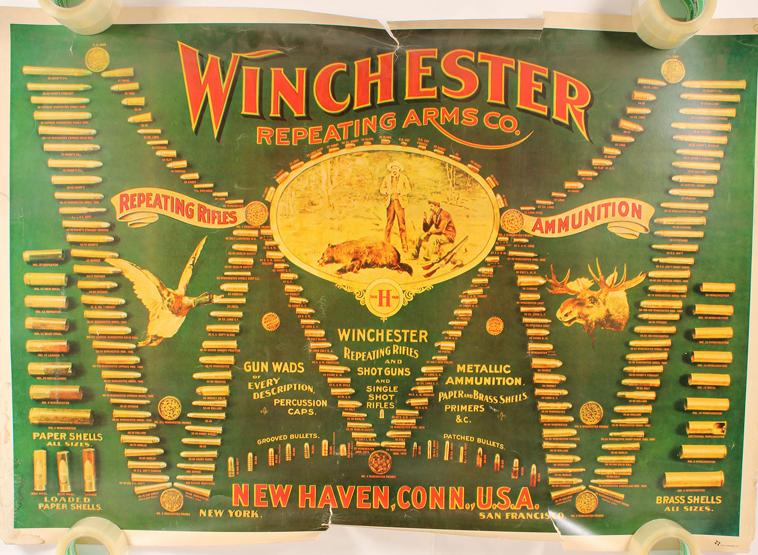 Winchester Double W Cartridge Board Litho, this heavy paper litho pictures all cartridges, this is a 1970's reproduction, this one has 9 more cartridges than the 1897 board, pictures bear hunting scene in center vinaigrette, mallard & bull moose, 52'' x 36'', shows edge wear & light soiling. Grade: Very Good + - Value: 100 to 400