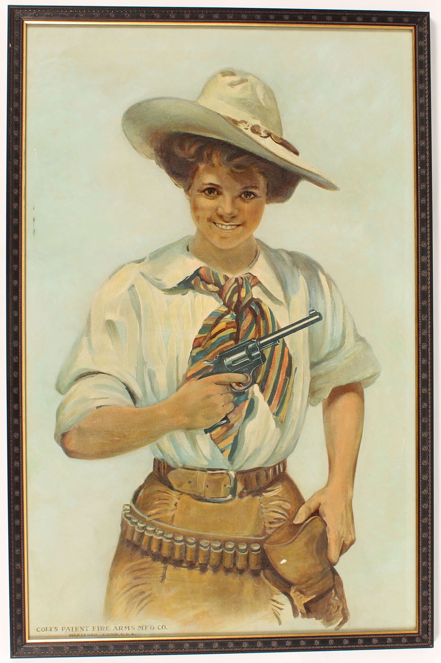 RARE Colt Patent Fire Arms MF'G Co. Poster, 2nd of 4 variations, pictures a cowgirl holding a Colt revolver with shotgun shells in her belt, 18 1/4'' x 29 1/2'', no bands, has wonderful colors with all most no wear, framed, professionally restored & professionally added linen back. Grade: Excellent + - Value: 2000 to 6000
