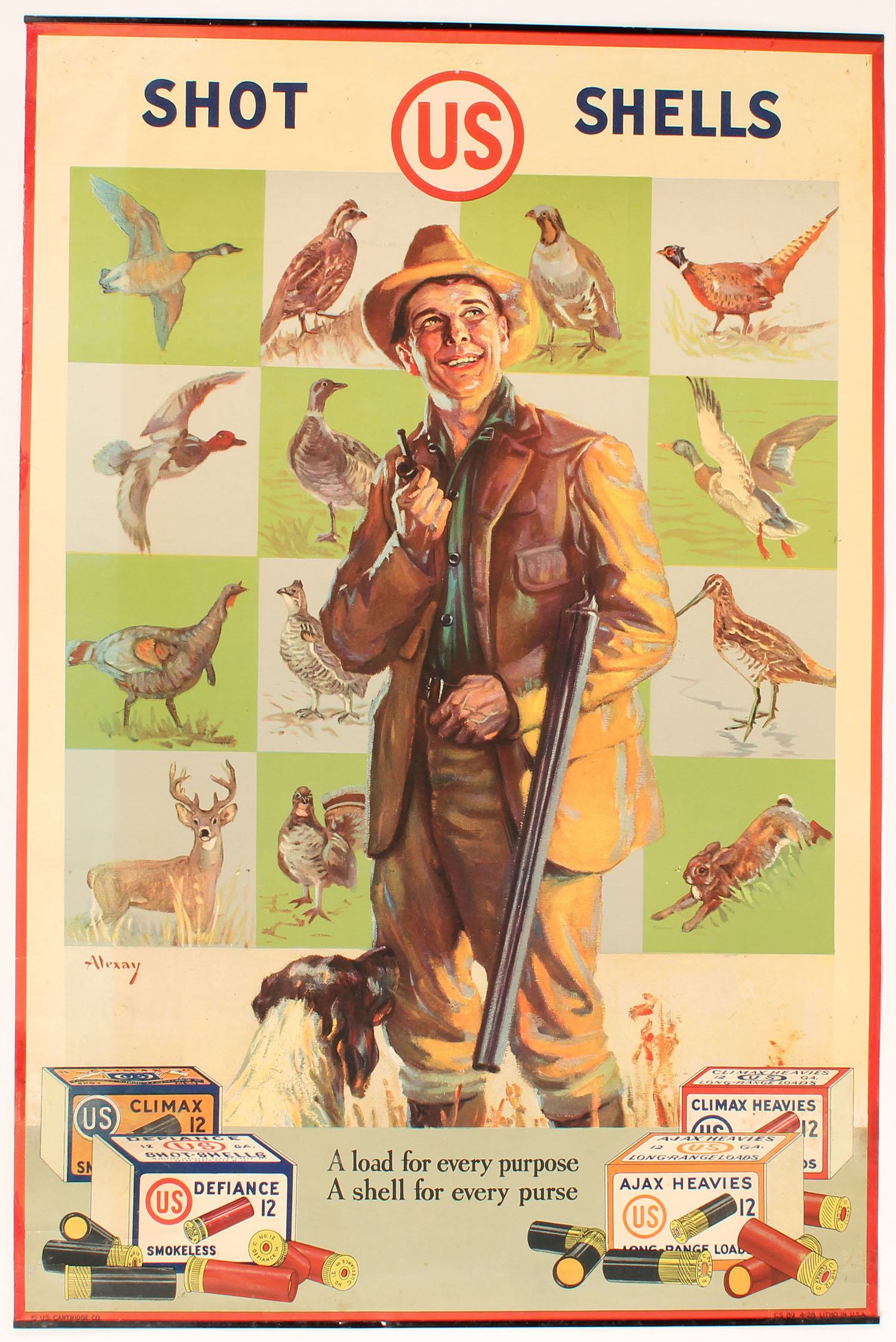 US Cart. Co. poster, pictures bird hunter holding a double shotgun with dog, also pictures many game animals & 2pc shotshell boxes, has metal bands top & bottom, 20'' x 30'', only one we have seen. Grade: Excellent - Value: 400 to 1200