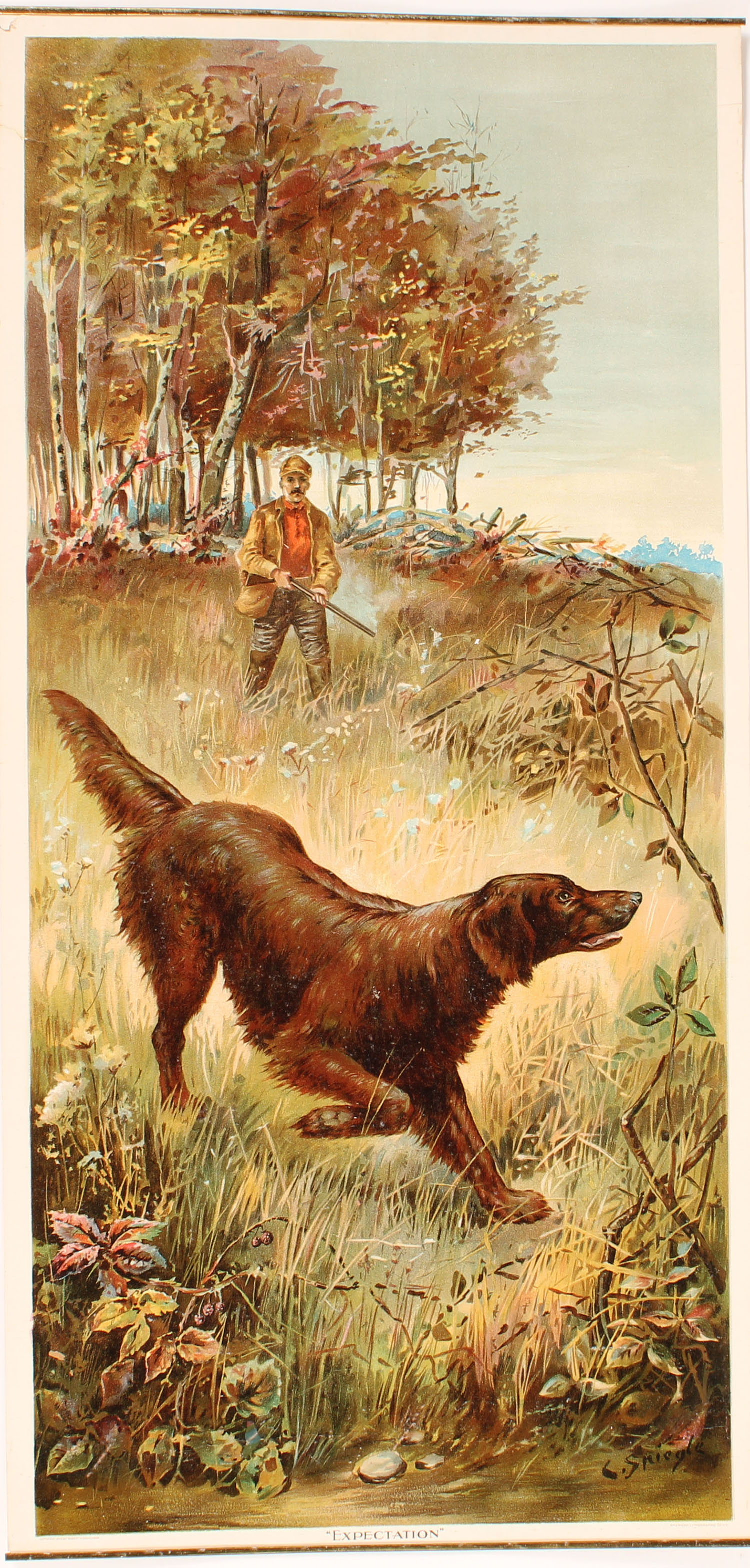 1898 EXPECTATION Poster by C. Sniegle, wonderful full color image of upland hunting scene with hunter & dog on point, brass bands top & bottom, 13 3/4'' x 28 1/4'', back side has large advertisement for B.T. Babbitt Baking Soda, New York, only one we have seen. Grade: Excellent - Value: 100 to 600