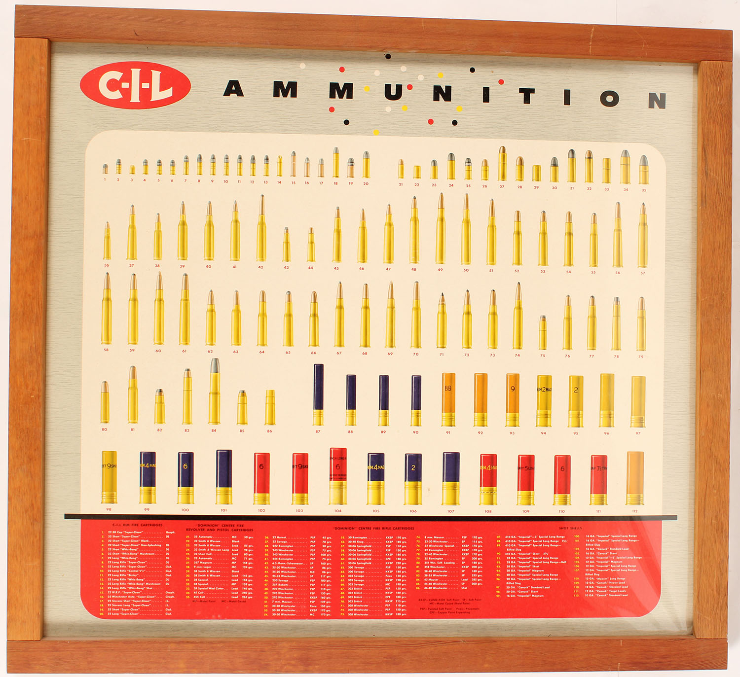 CIL Diecut pictures all ammunition, each one is numbered & described at the bottom, 30'' x 27''. Grade: Excellent ++ - Value: 100 to 300