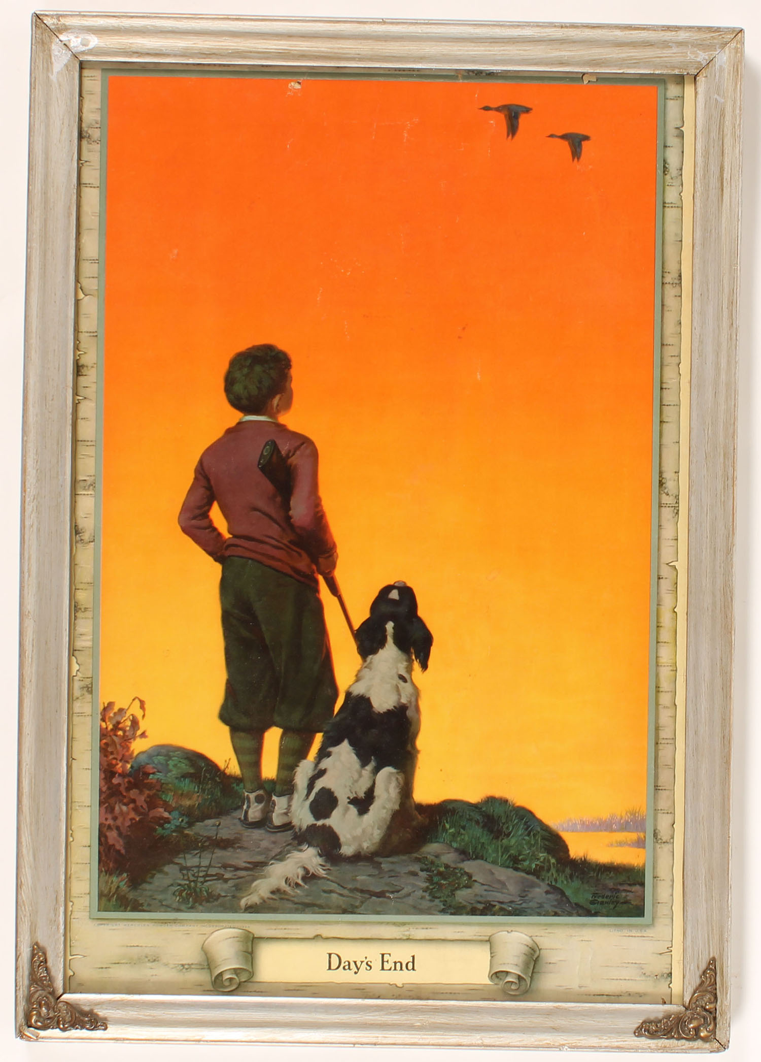 1936 Hercules calendar top, pictures a young boy & his dog watching ducks fly just out of range, no band on top , 13'' x 19 1/2'', framed. Grade: Excellent - Value: 40 to 100