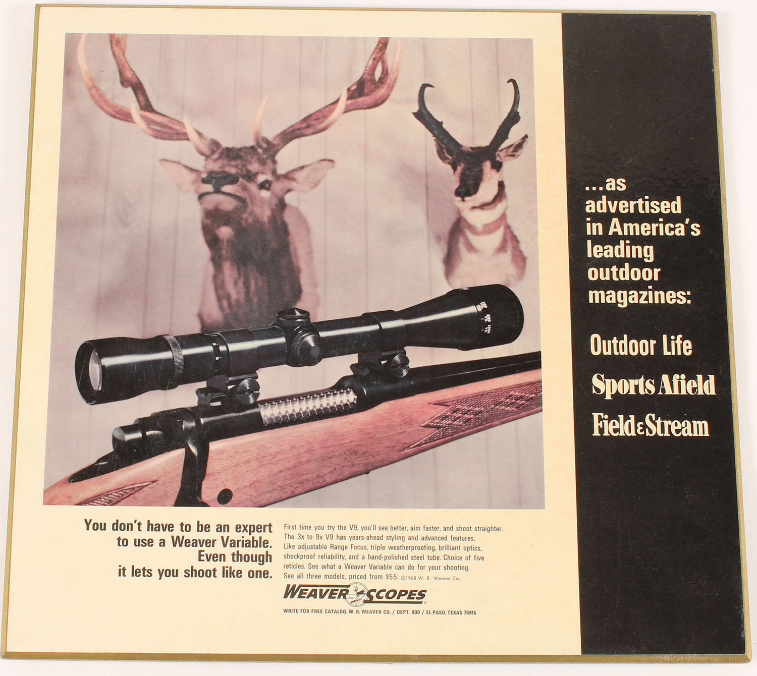 Weaver Scopes wood plaque, 12'' x 12''. Grade: Excellent - Value: 10 to 50