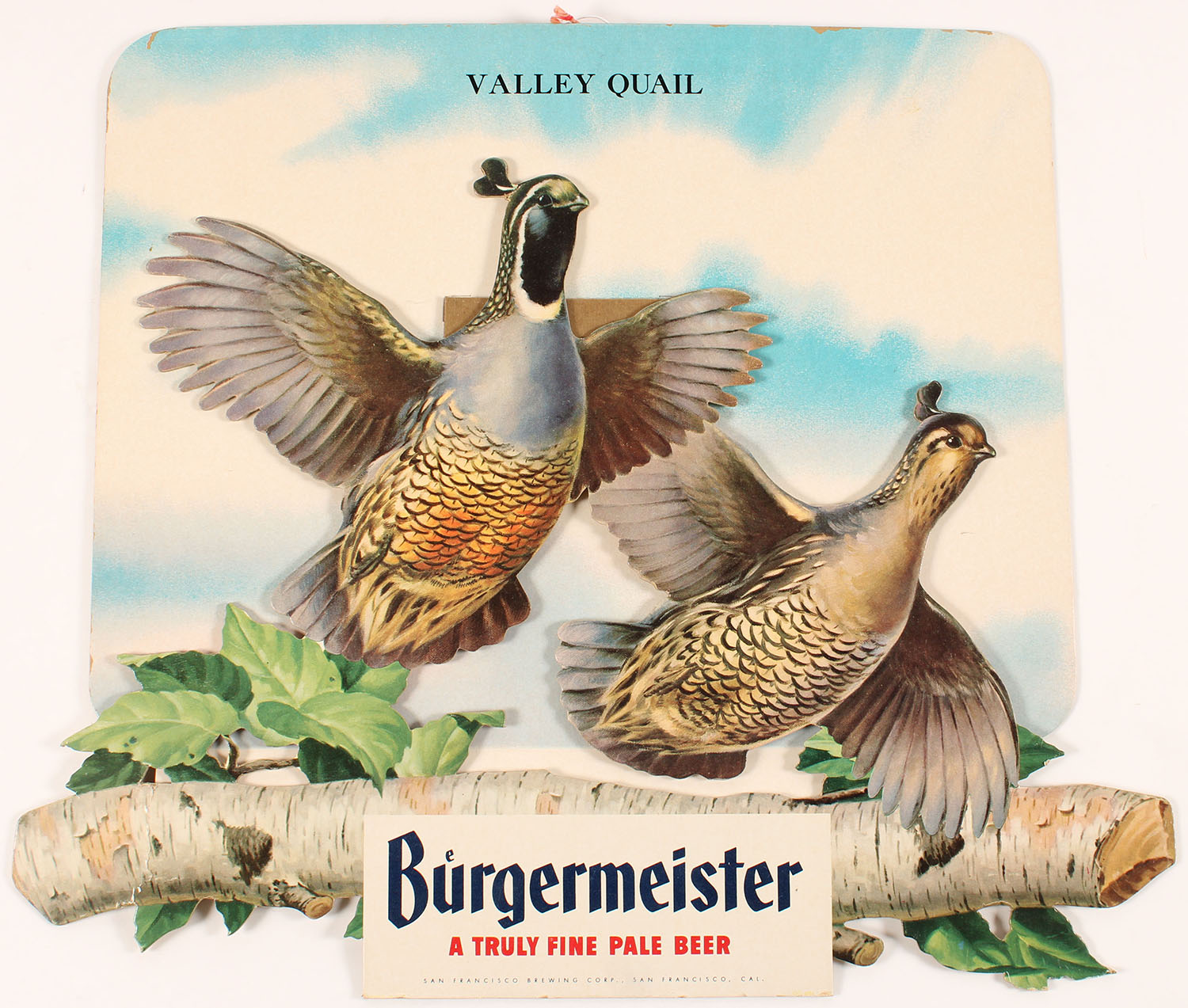 Burgermeister Valley Quail 3D Diecut, pictures two qwuail in flight over log with blue sky in background, 17'' x 14 1/2''. Grade: Excellent + - Value: 10 to 60