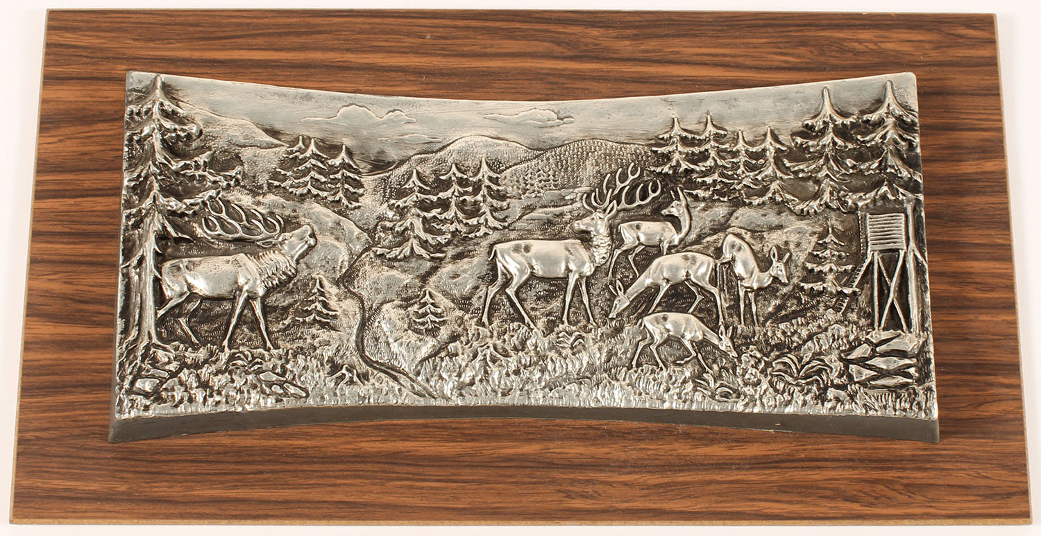3D plastic mold of elk in forest scene mounted on wood, 15'' x 9''. Grade: Excellent - Value: 10 to 30