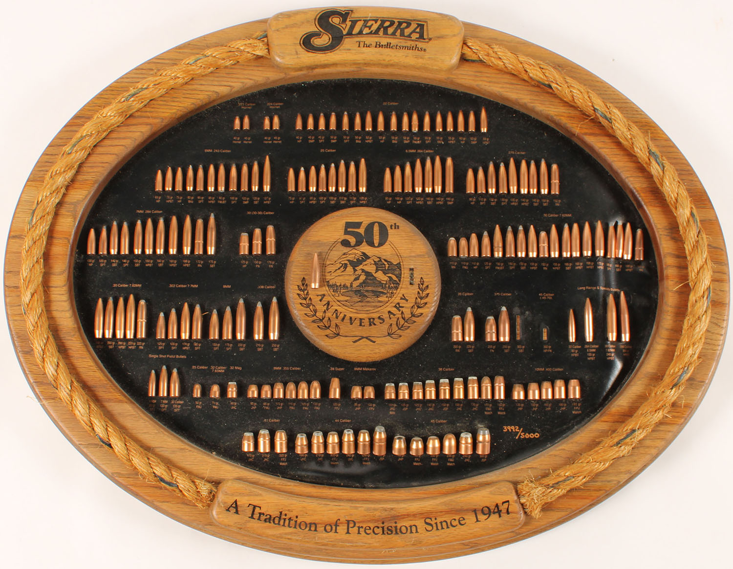Sierra Bullet Board, 50th Anniversary, Early real wood outer wood base, All bullets intact but backing has come loose on right & bottom edges 25'' wide. Grade: Very Good - Value: 50 to 250