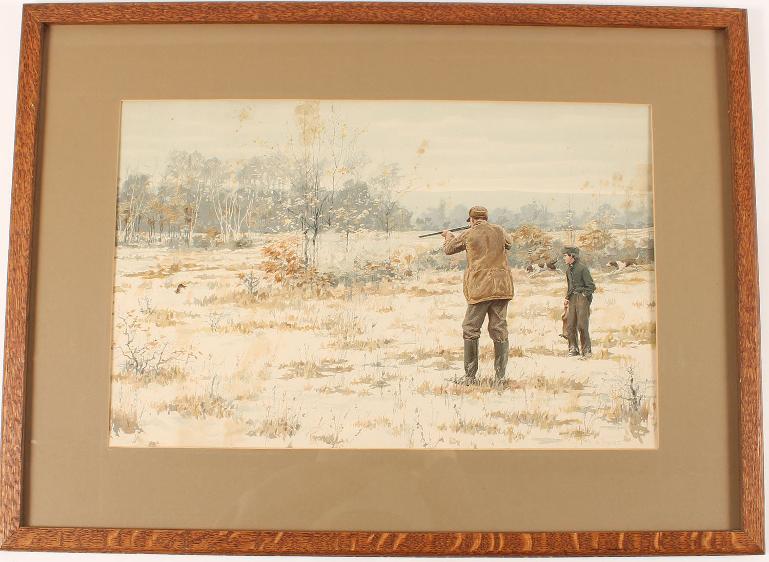 1896 A.B.Frost Print, pictures father & son rabbit hunting in scow scene, has great colors but also some spotty stains at the top, 19 1/2'' x 12 1/2'' image size, framed, Grade: Very Good + - Value: 40 to 200