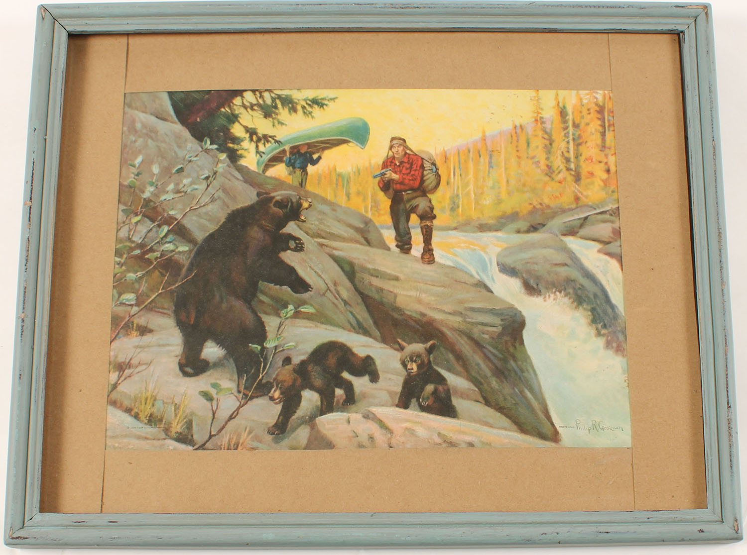 Philip R. Goodwin print, nice full color image of hunters trying to pass a rapid & find a black bear sow and her two cubs, image size 11'' x 8'', framed. Grade: Excellent - Value: 20 to 100