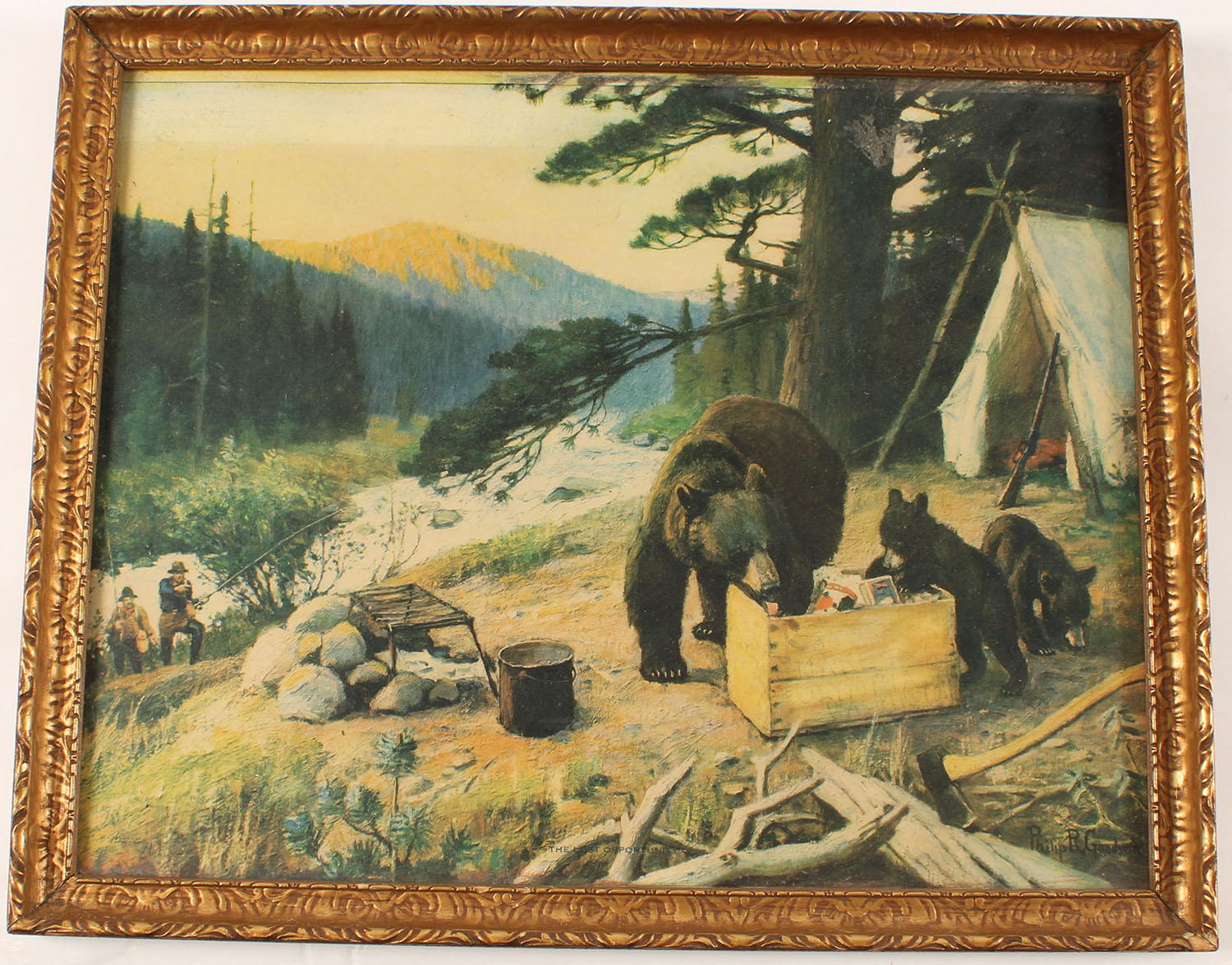 Philip R. Goodwin print, ''THE LOST OPPORTUNITY'', nice full color image of a fishermen returning to camp with black bears raiding the food, image size 13 1/2'' x 11'', framed. Grade: Excellent - Value: 20 to 100