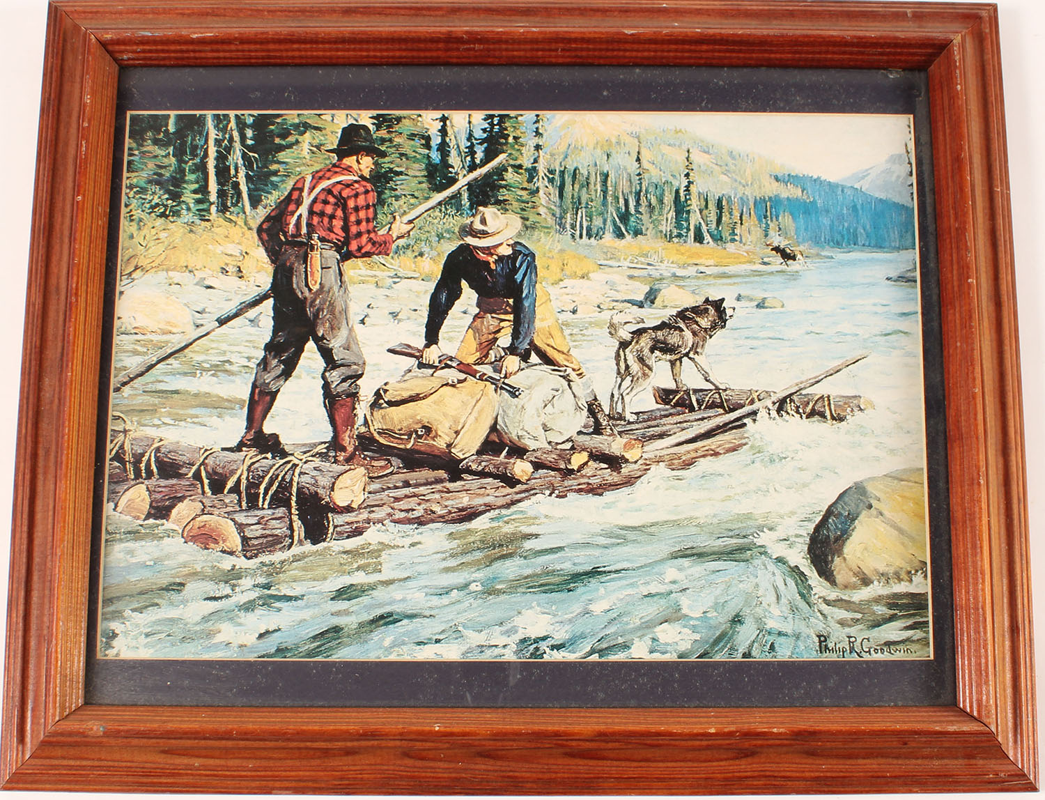 Philip R. Goodwin print, nice full color image of a moose hunters on hand made log raft with bull moose crossing down stream, image size 13'' x 9'', framed. Grade: Excellent - Value: 20 to 100