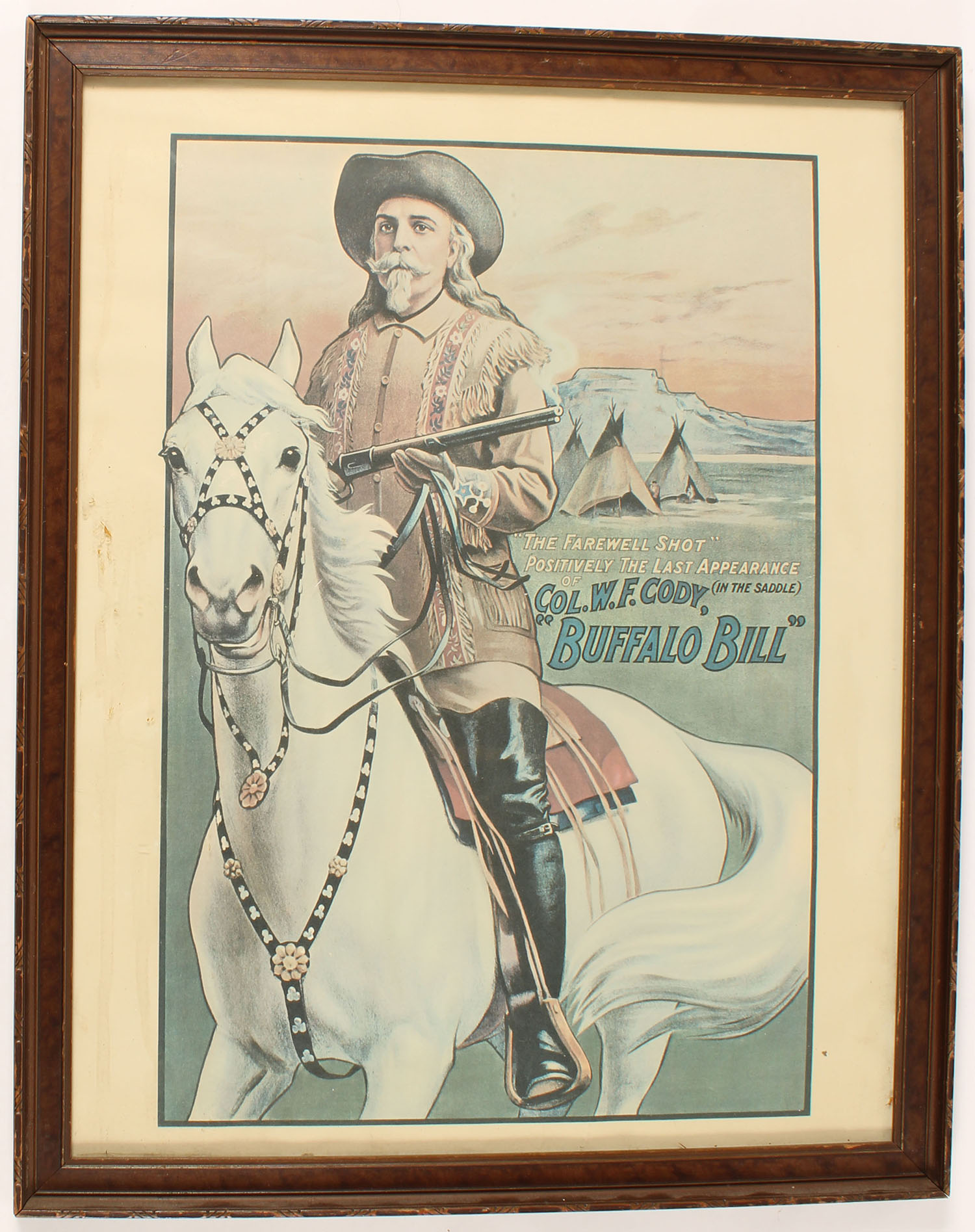 Col. W.F. Cody ''BUFFALO BILL'', print of him on horse back & Tee-Pee's in background, 11 1/2'' x 17'' image size, framed. Grade: Very Good + - Value: 10 to 50