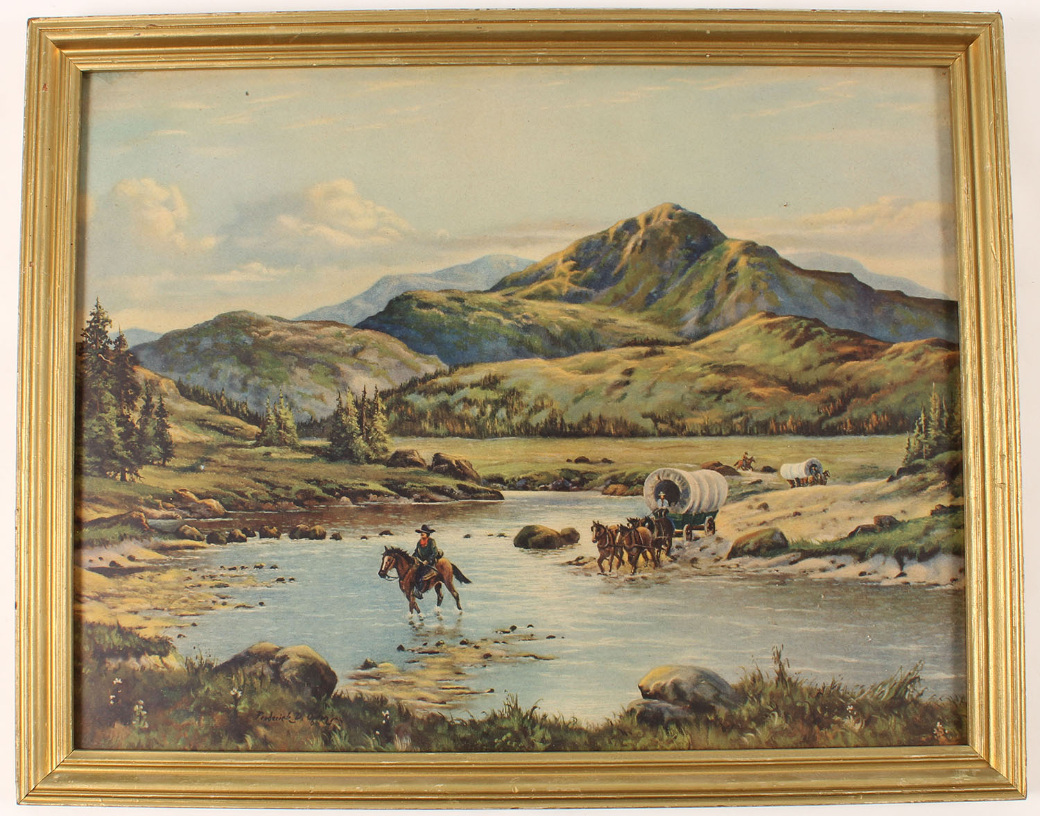 Fredrick D. Ogden print of covered wagons crossing a river, 17 1/2'' x 14'', framed. Grade: Excellent - Value: 10 to 50