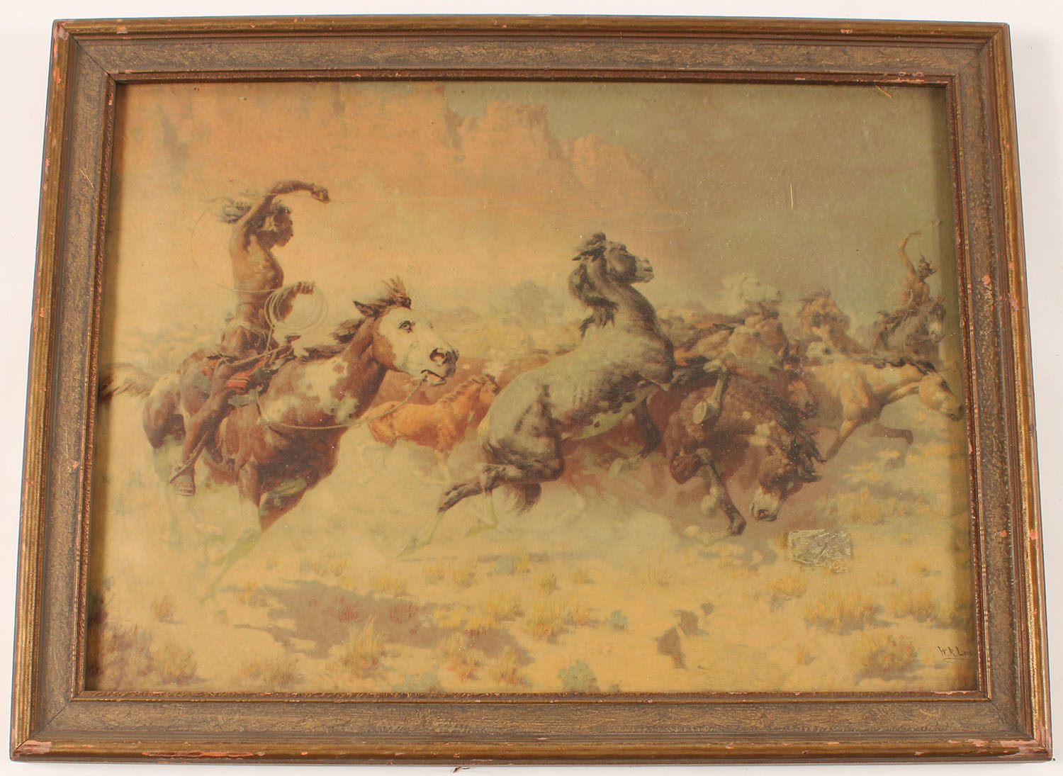 W.R. Leigh print, pictures Indians on horse back trying to gather some horses on the plains, image size, 13'' x 9'', framed. Grade: Excellent - Value: 10 to 50