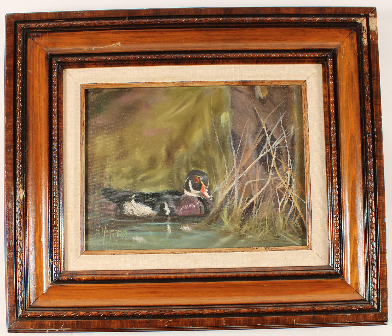 Original Oil on canvas by Joyce Henderson, Derby, KS, pictures a Woodduck drake on water, image size 11 1/2'' x 9'', framed. Grade: Excellent ++ - Value: 50 to 400
