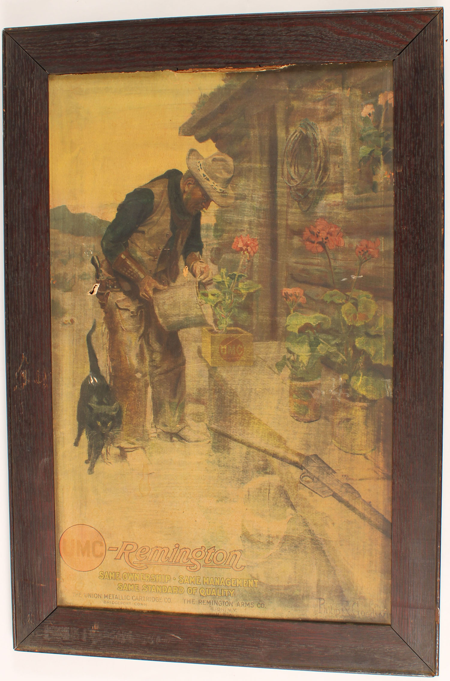 Remington Poster by Philip R. Goodwin glued on to board, show fading & pictures a cowboy watering his flowers with a rifle in the bench, image size 13 1/2'' x 21 1/2'', framed. Grade: Good - Value: 30 to 200