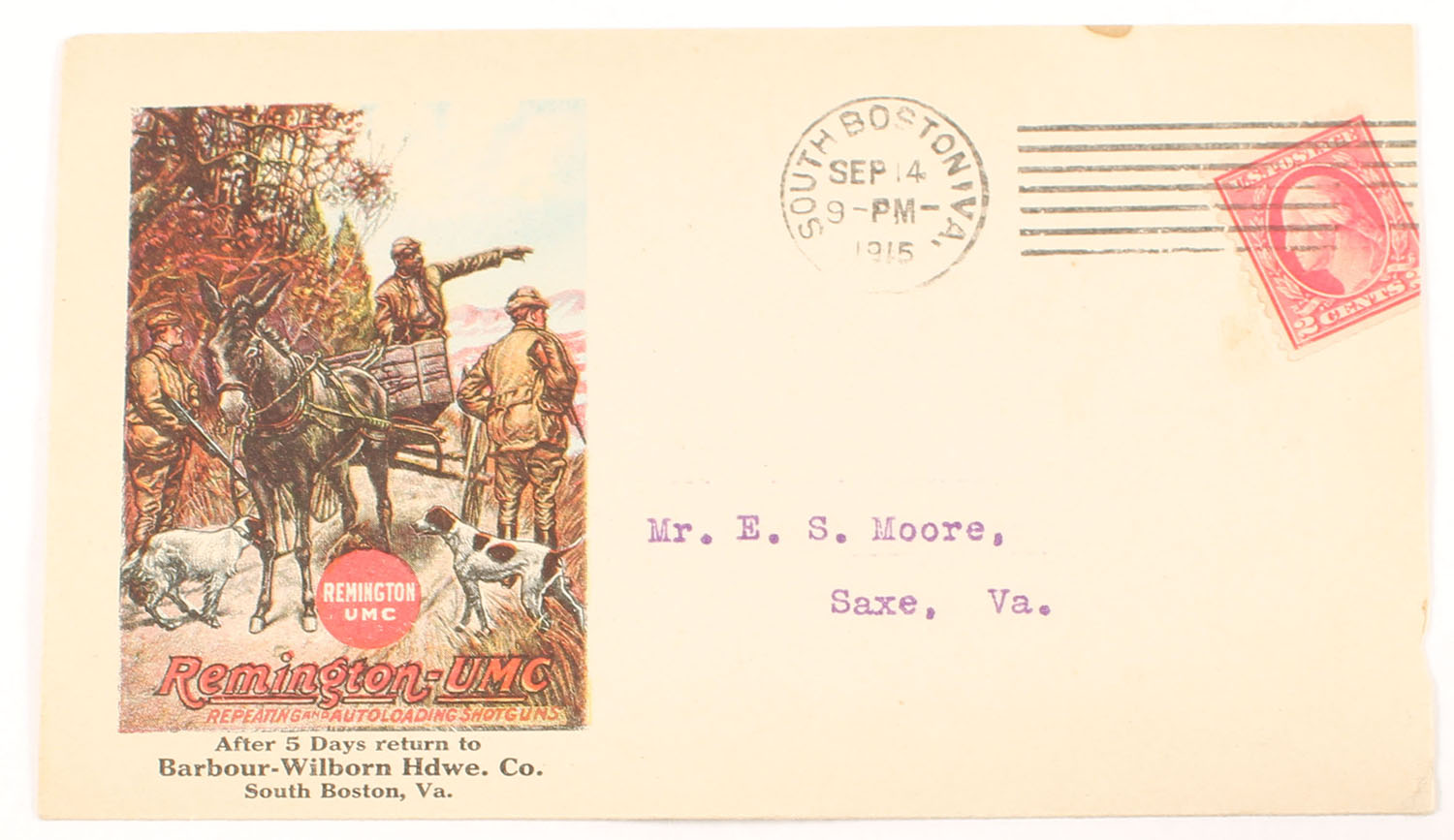 Remington UMC Envelope with advertising, wonderful full color image of hunters asking farmed for hunting rights, back is unmarked, used, circa 1915, nice colors. Grade: Excellent - Value: 40 to 200