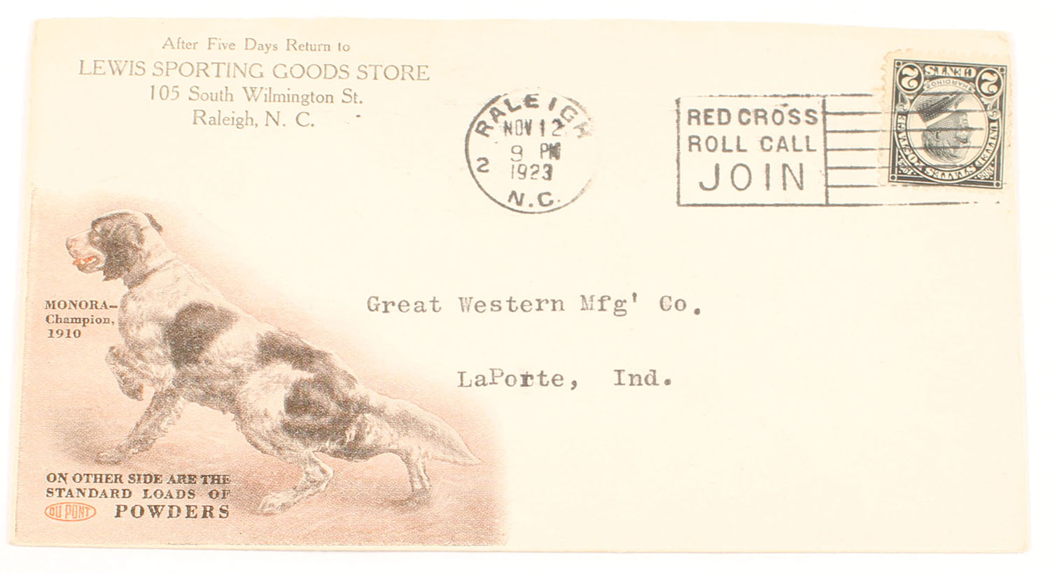 Dupont Powders Envelope, used dated 1923, full color image of MONORA 1910 Champion field trial dog, back has loading for all different kinds of shells. Grade: Very Good ++ - Value: 20 to 150