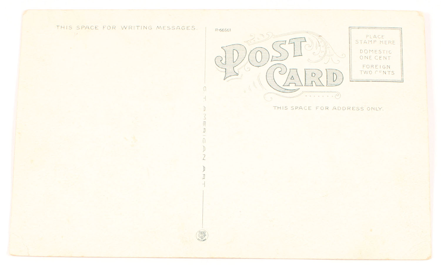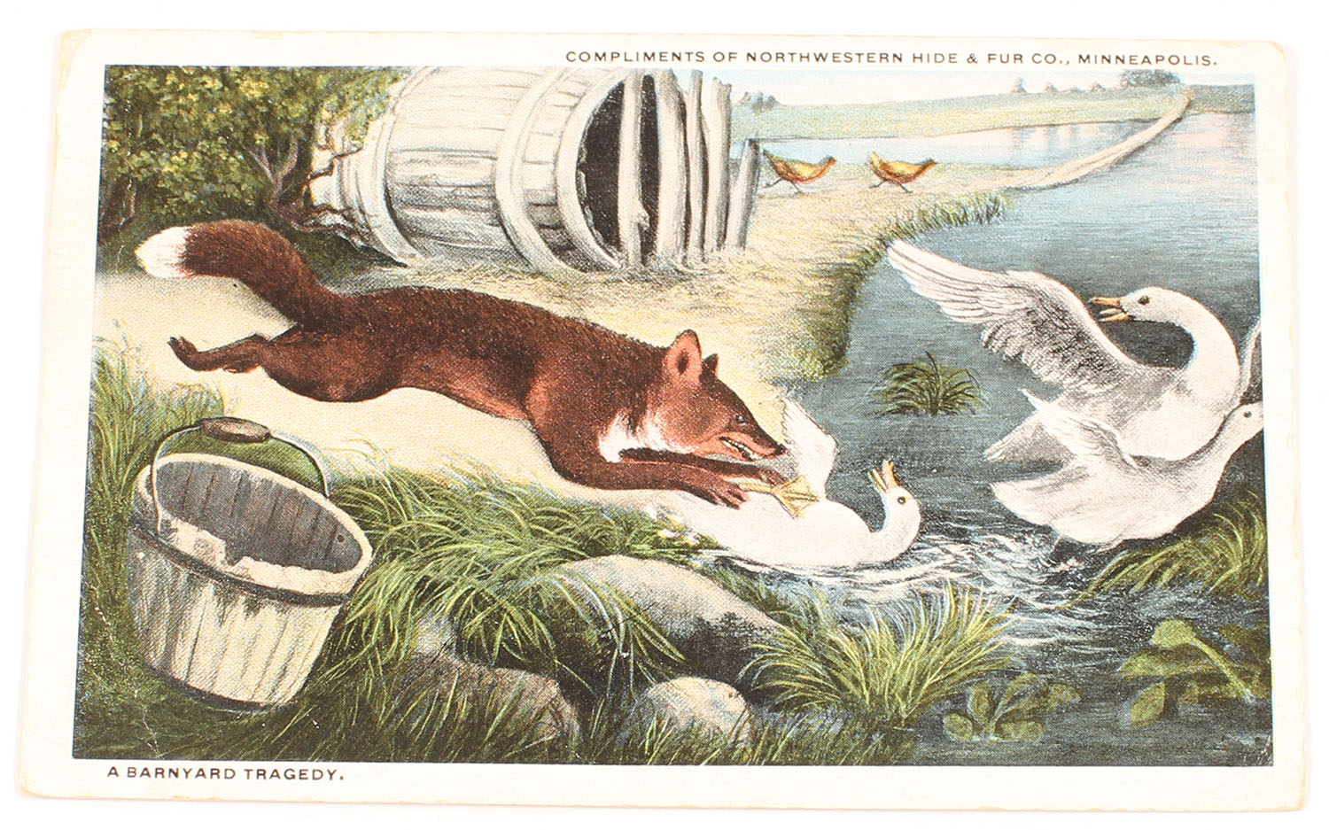 Northwestern Hide & Fur Co. post card, full color image of fox attacking swans on shores edge, unused. Grade: Excellent - Value: 6 to 30