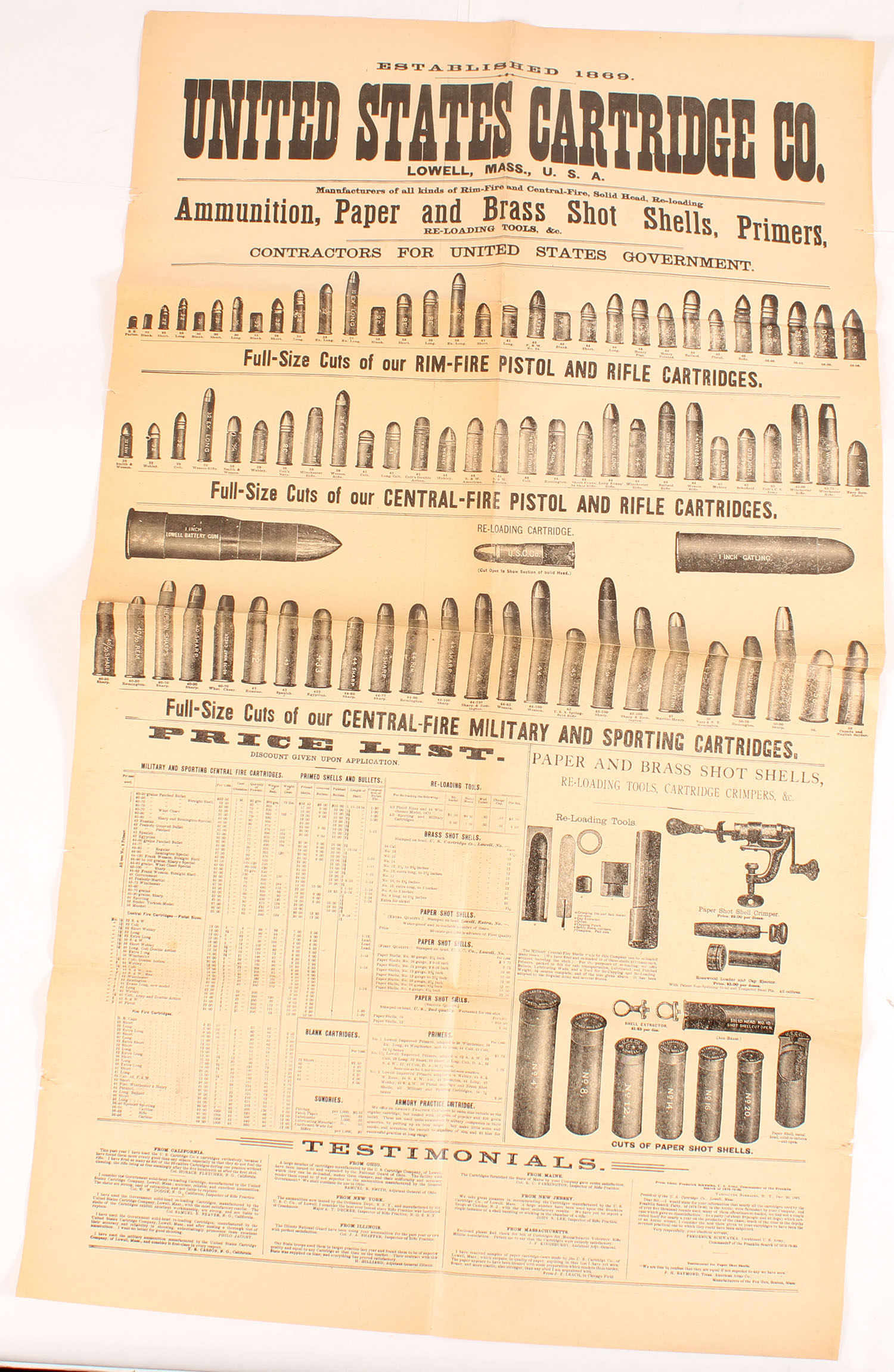 Large paper adv. For United States Cartridge Co., pictures all their ammo, 19'' x 34'', shows age soiling & edge wear. Grade: Good ++ - Value: 2 to 30