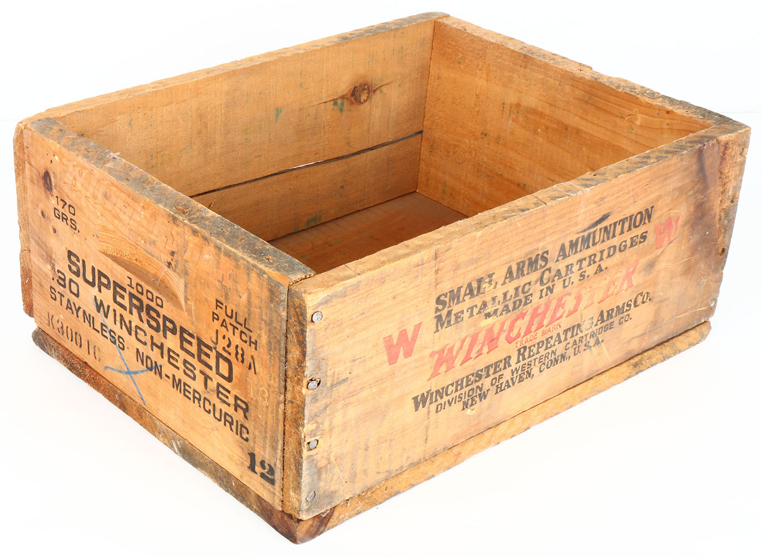Winchester Super Speed, 30 winchester, nail construction wood shipping crate, black & Red print is solid, crack ot one end. Grade: Excellent - Value: 10 to 40