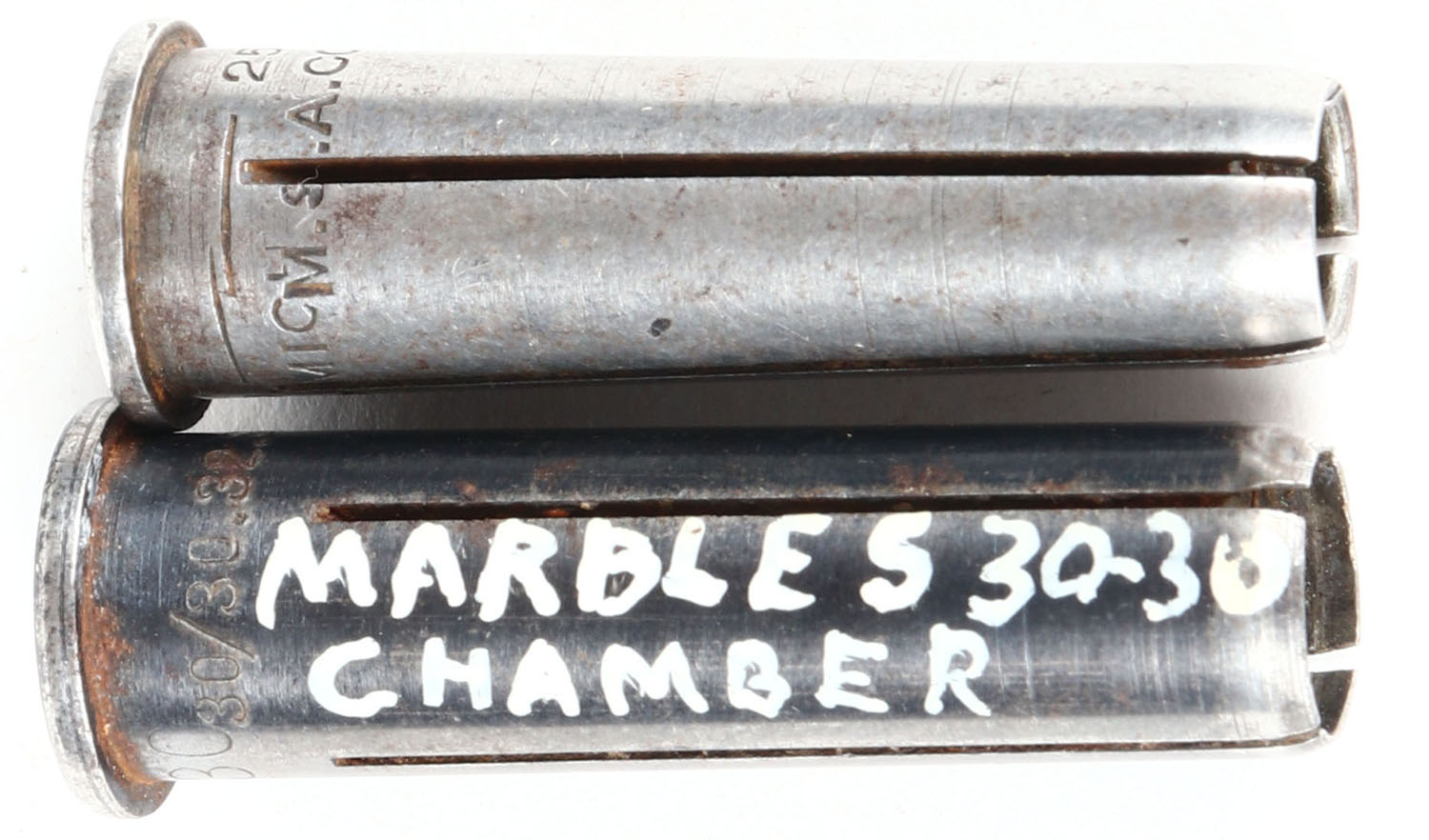 Lot of (2) Marbles Auxiliary carts, (1) No. 151 (.30-30 Win. - .32 Short Colt), (1) No. 152 (.25-35 Win. - .25 Auto.). Grade: Excellent - Value: 6 to 40