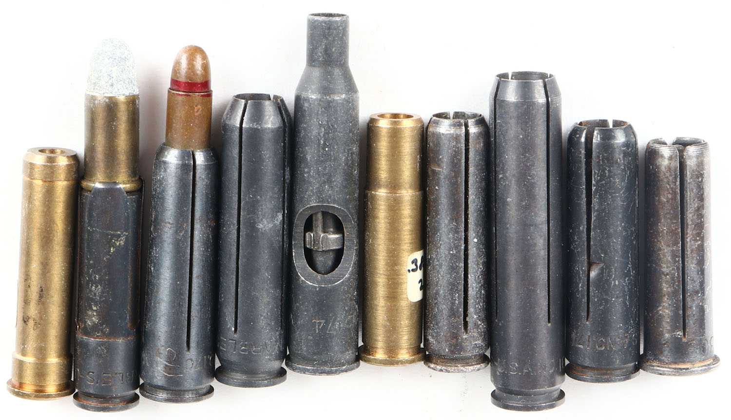 Lot of (8) Marbles Aux Carts & (2) unknown mfg. .38spl/.357 - unknown caliber, MARBLES AUXILIARY CARTS: (1) No. 162 (.30-03/.30-06 - .32 Smith & Wesson), (1) No. 173 (6.5 Mannlicher - .25 Colt Auto.), (1) No. 170 (250-3000 Savage - .25 Colt Auto.), (1) No. 150 (.30 Rem. - .32 Short Colt), (1) No. 163 (.25 Rem. - .25 Colt Auto.), (1) No. 154 (.303 Savage - .32 Colt Auto.), (1) No. 171 (.250-3000 Savage - .25 Short Stevens Rimfire), (1) No. 174 (.220 Swift - .22 Long Rifle). Grade: Excellent - Value: 20 to 60