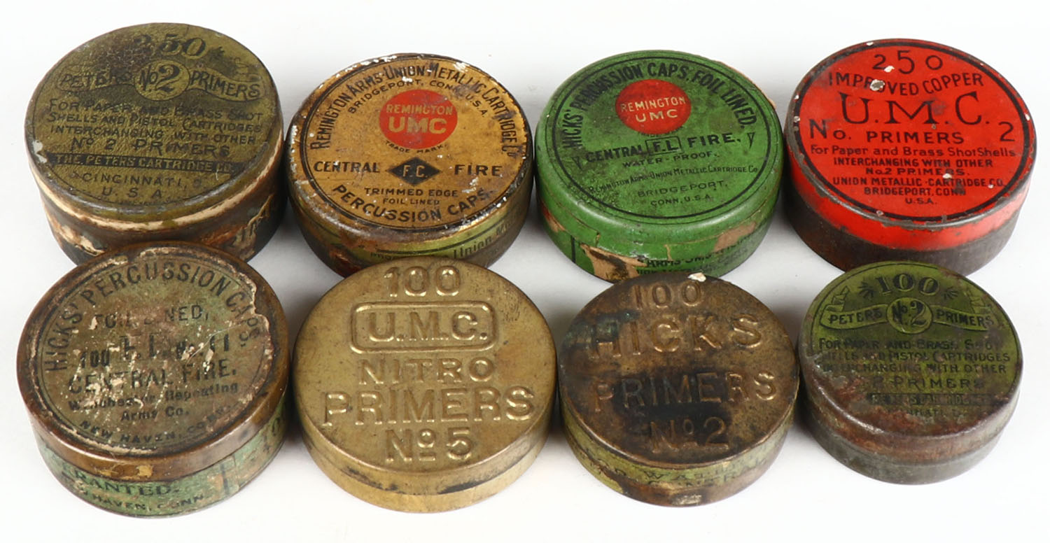 Lot of Antique Primers tins, 5 partial 3 empty. Grade: Very Good + - Value: 20 to 80