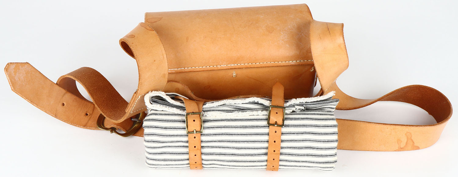 Leather sachel with towel and full of powder loads for flintlock or muzzleloader. Grade: Excellent ++ - Value: 20 to 60