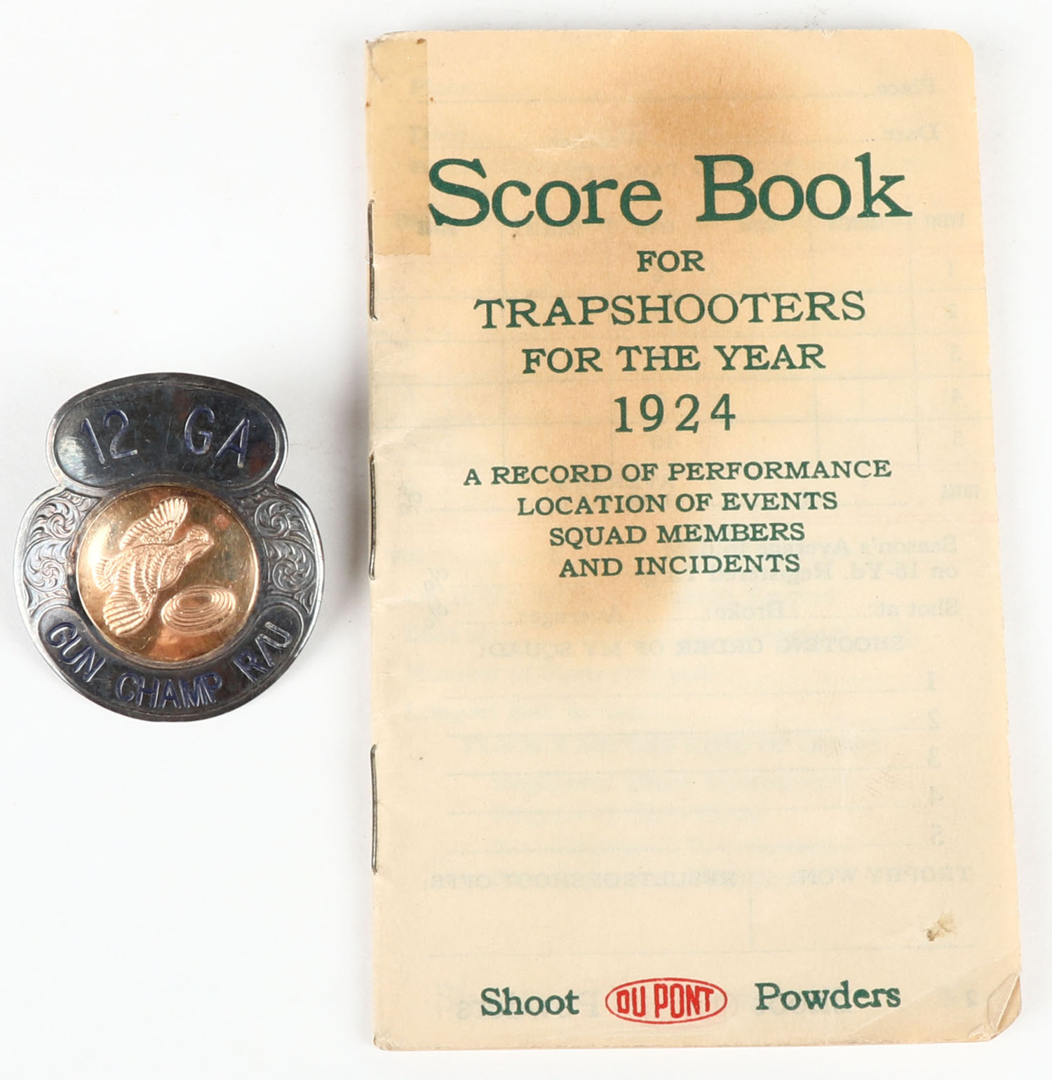 Lot of 2 , trap shooting trophy pinback nad trapshooters score book 1924. Grade: Very Good ++ - Value: 10 to 50