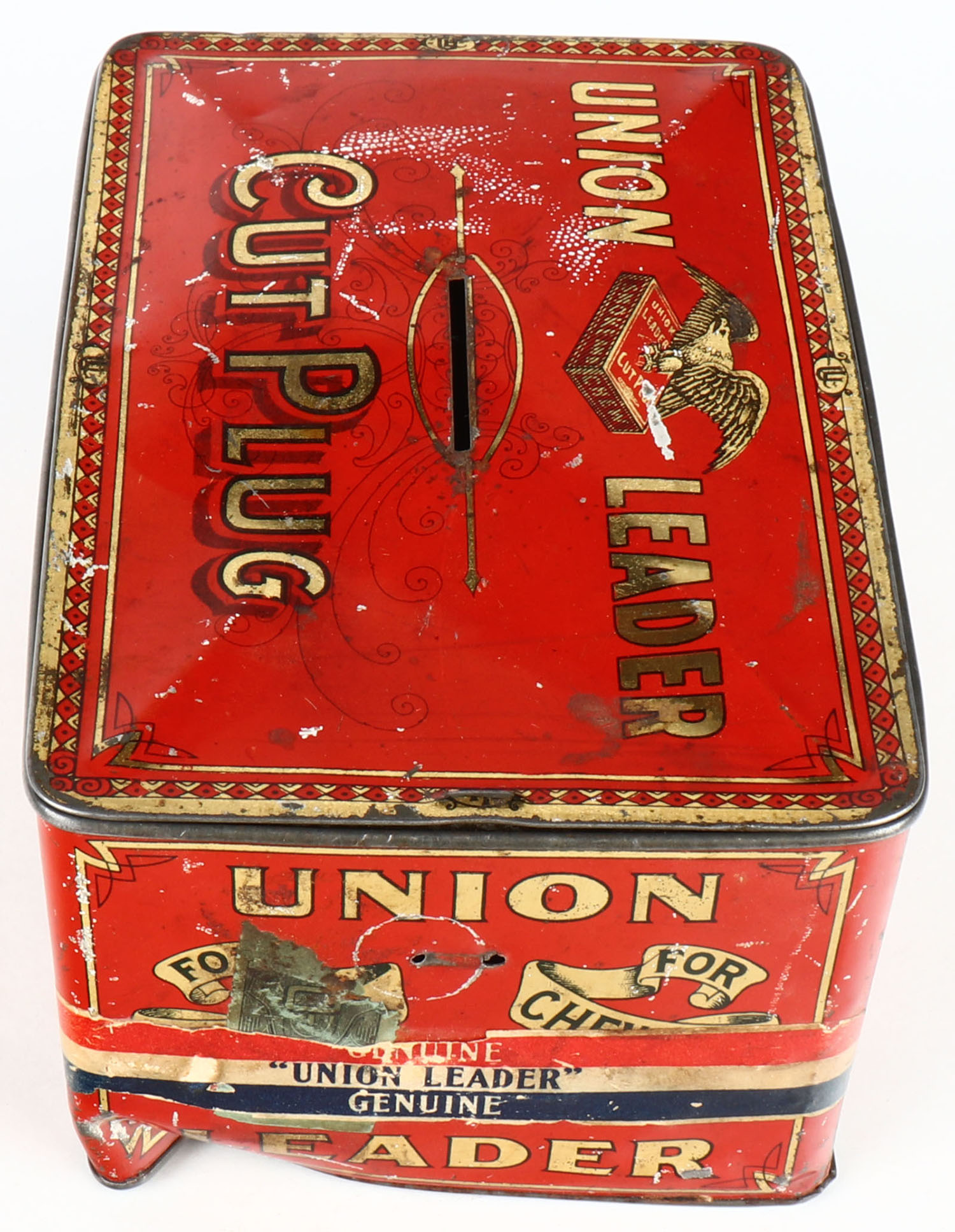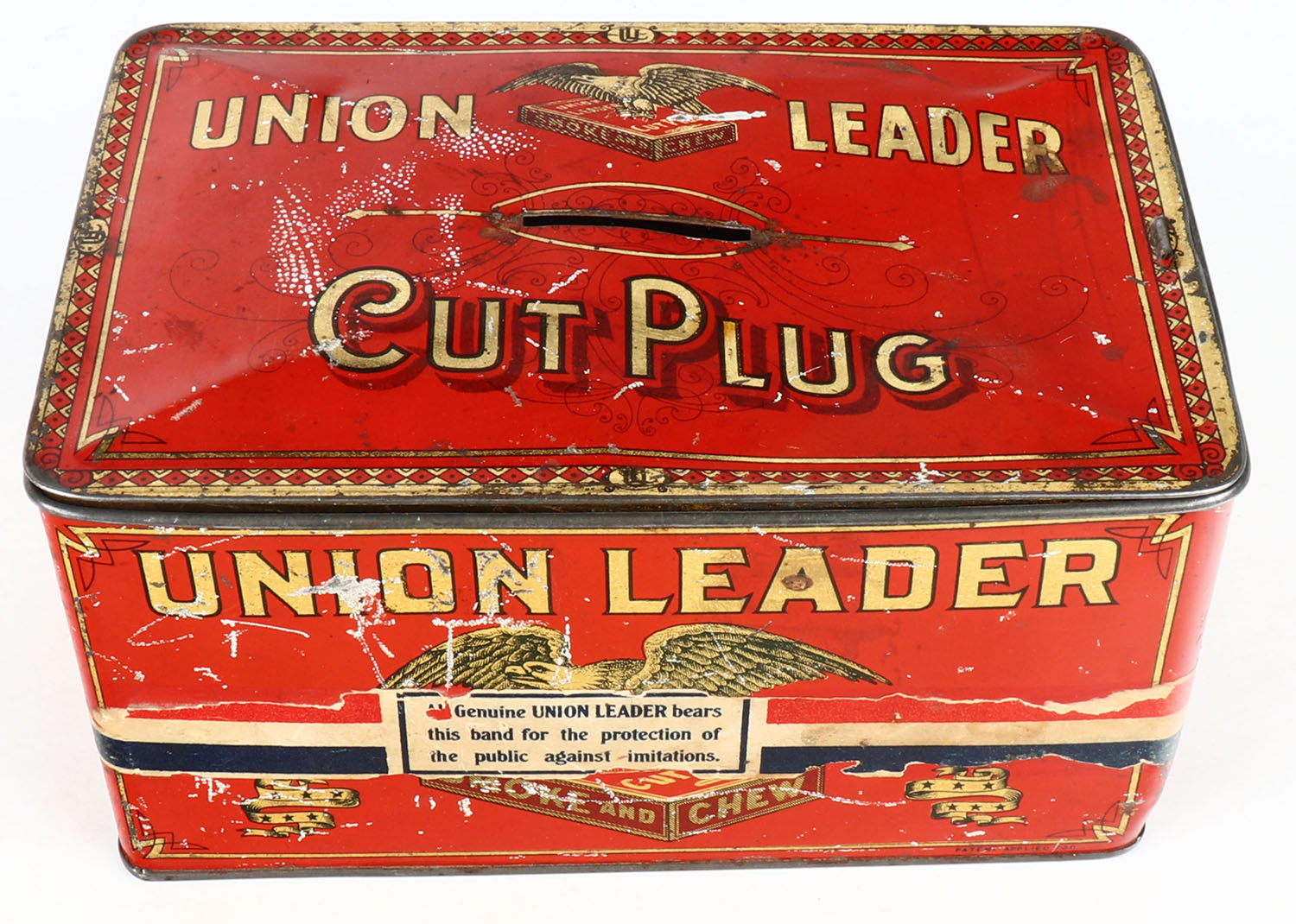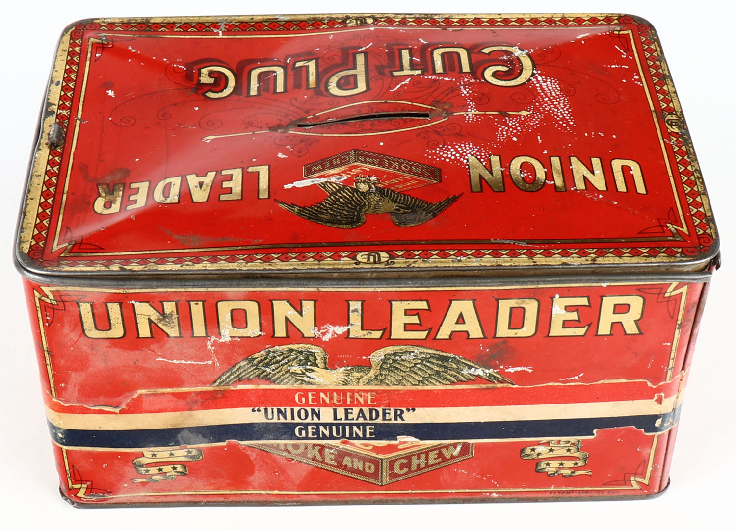 Large metal tobacco tin Empty, Union Leader. Grade: Very Good ++ - Value: 20 to 50
