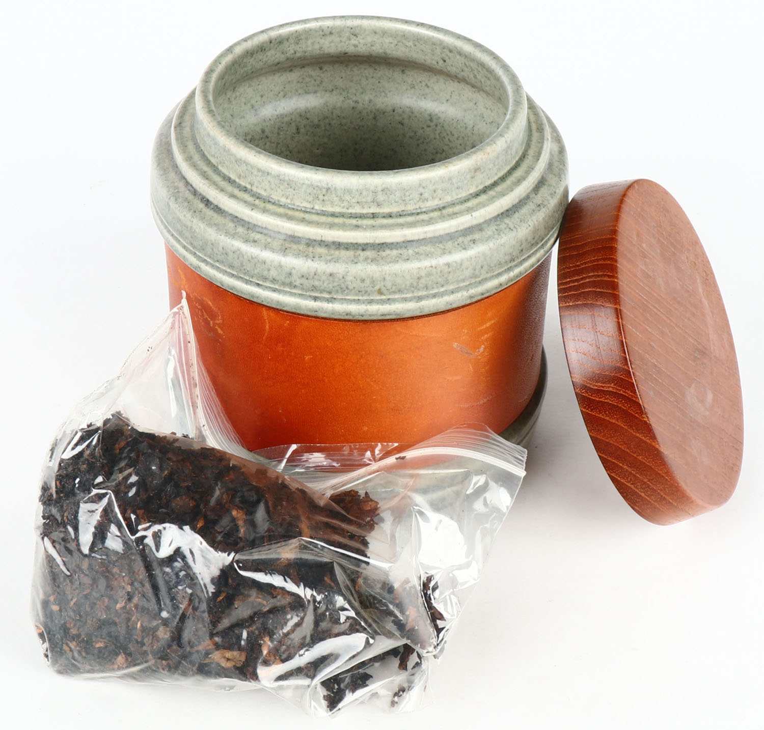Tobacco humidor with tobacco in side. Grade: Excellent - Value: 10 to 50
