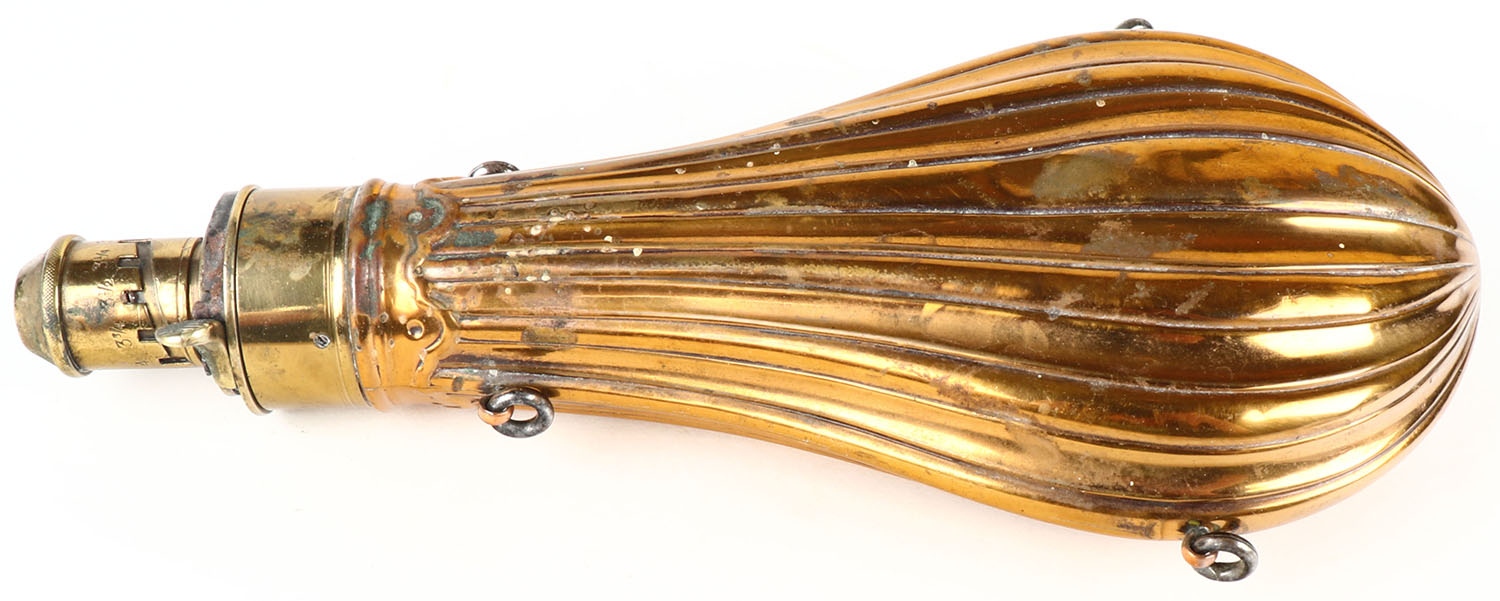 RARE! G & J W Hawksley Shefield brass powder flask, has age soiling. Grade: Excellent - Value: 50 to 100